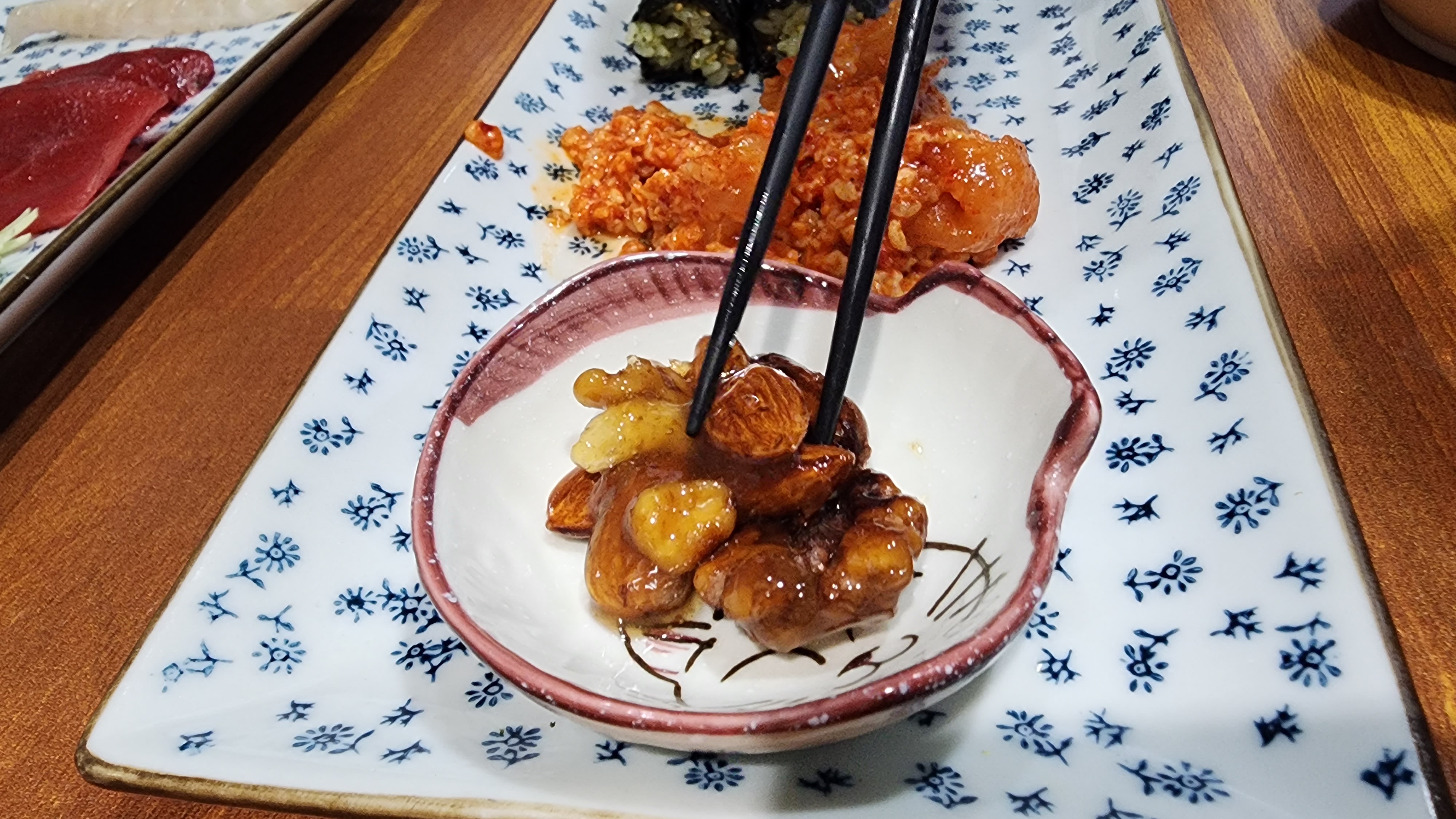 회를 얇게 썰어서 와사비와 함께 낸 것을 요렇게 젓가락으로 말아서 먹으면 식감이 아주 좋다. 식전주와 함께 곁들여 먹으면 식욕이 매우 샘솟는 느낌.