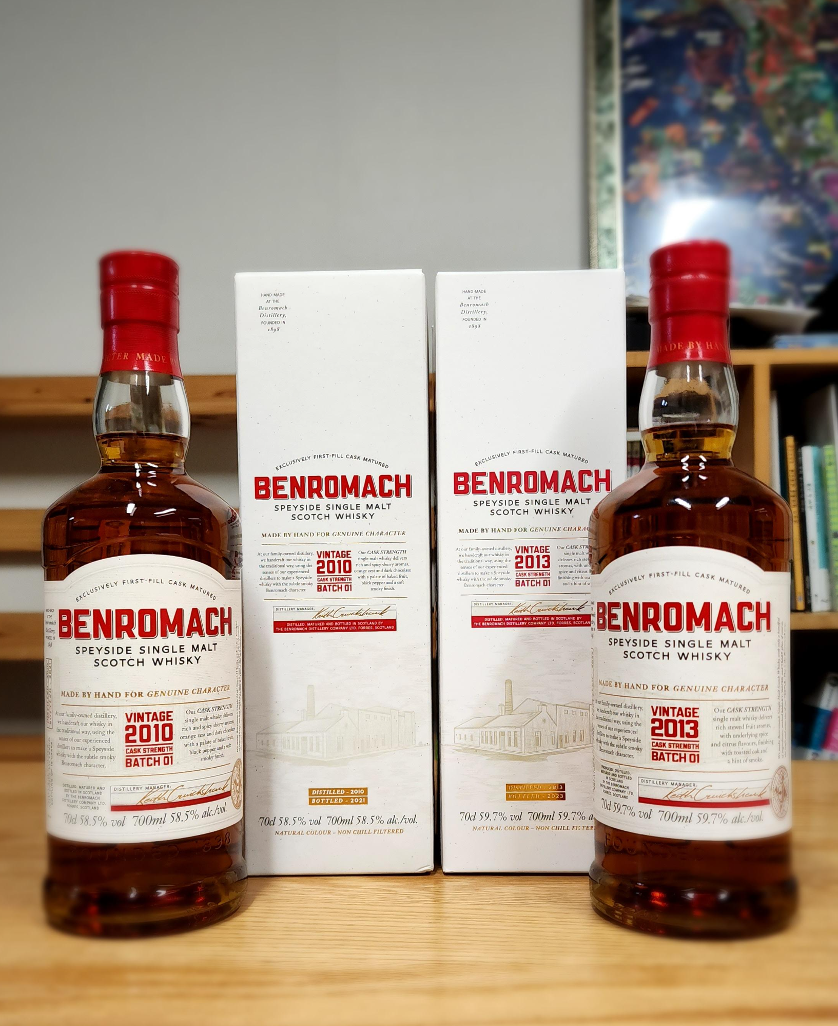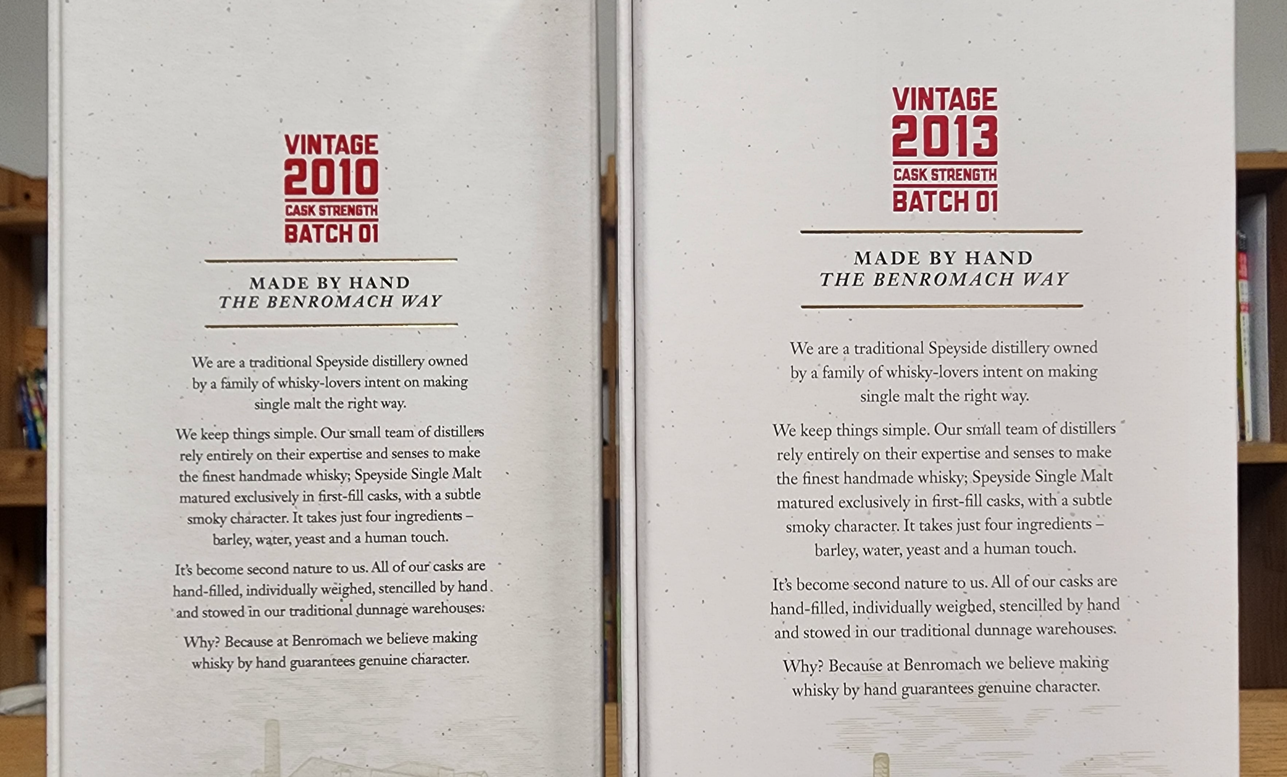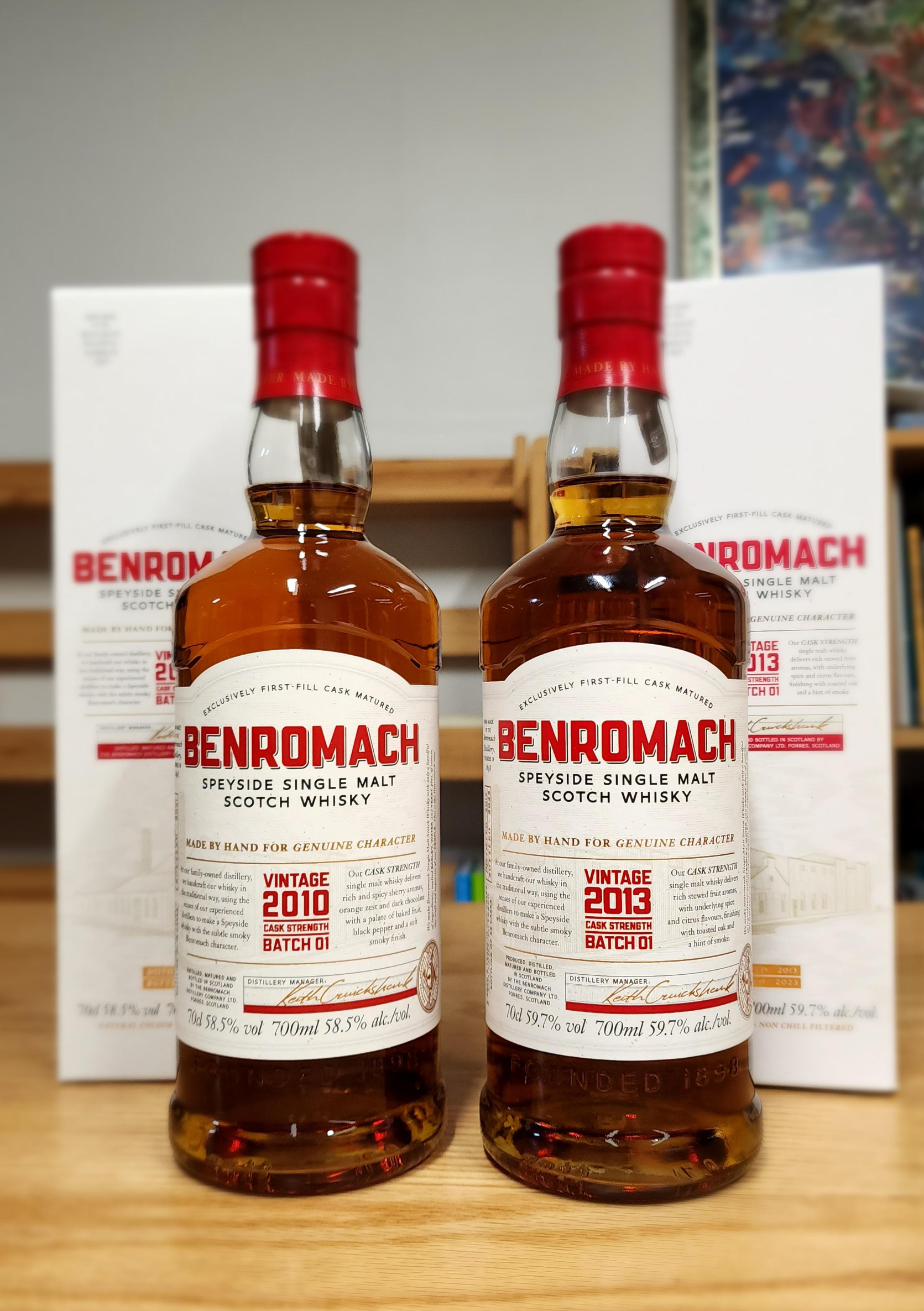 벤로막 빈티지 2010(Benromach Vintage 2010) & 벤로막 빈티지 2013(Benromach Vintage 2010). 둘 다 캐스크 스트렝쓰(Cask Strength)이고 배치 1(Batch 1)이다. 2010년 빈티지는 작년에 사 두었던 건데, 이번에 2013년을 산 김에 같이 포스팅. 이렇게 같은 시리즈의 아이 빈티지를 나란히 보유하게 되었다.
