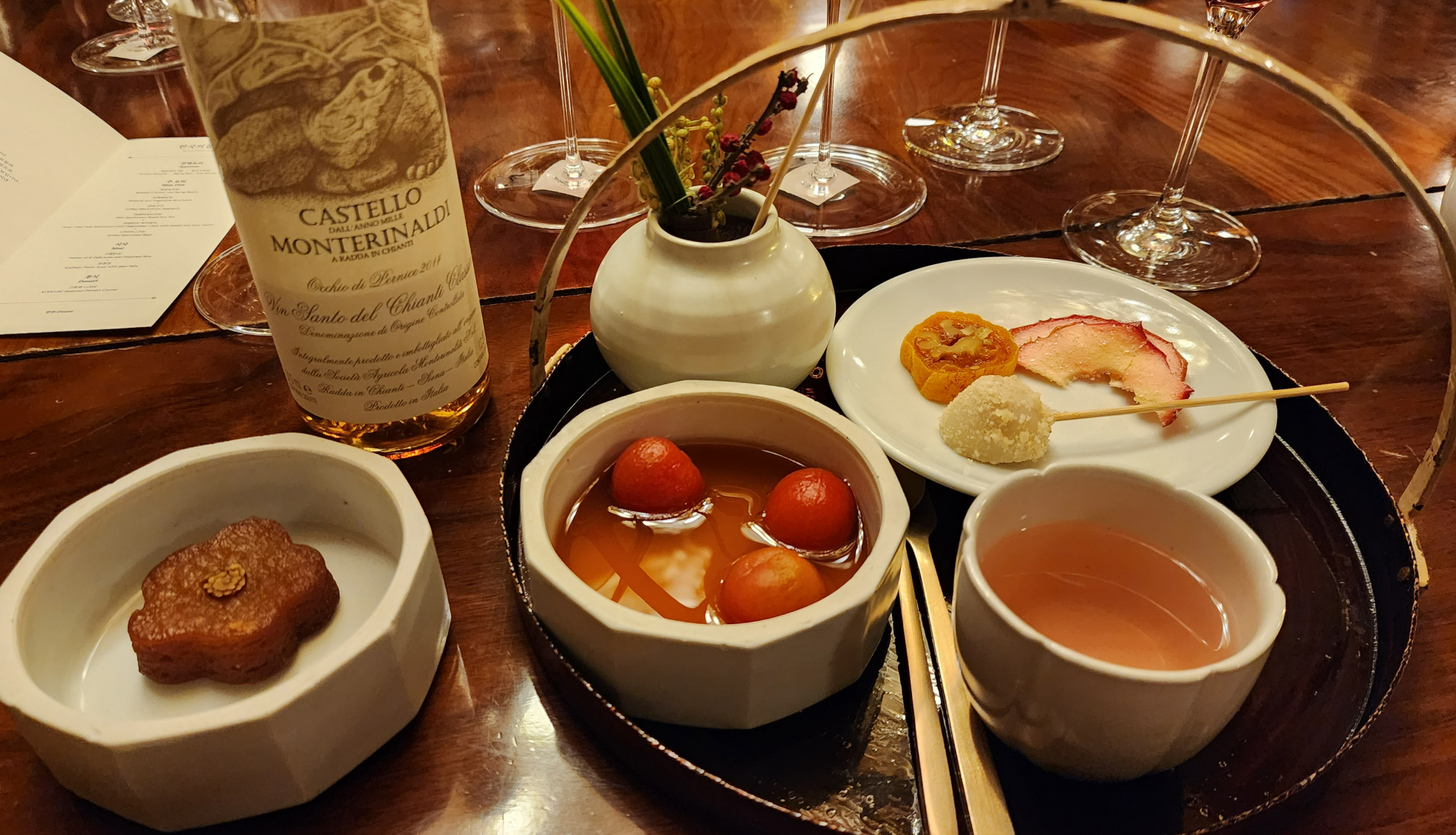그리고 고호재 다과상. 한국의집의 또 다른 공간인 고호재에서 내는 디저트를 그대로 활용했나 보다. 호두를 박은 곶감과 수정과에 절인 방울토마토, 약과 등 모든 디저트들이 빈산토와 정말 찰떡궁합이었다. 물론 디저트 각각의 완성도도 훌륭했고.