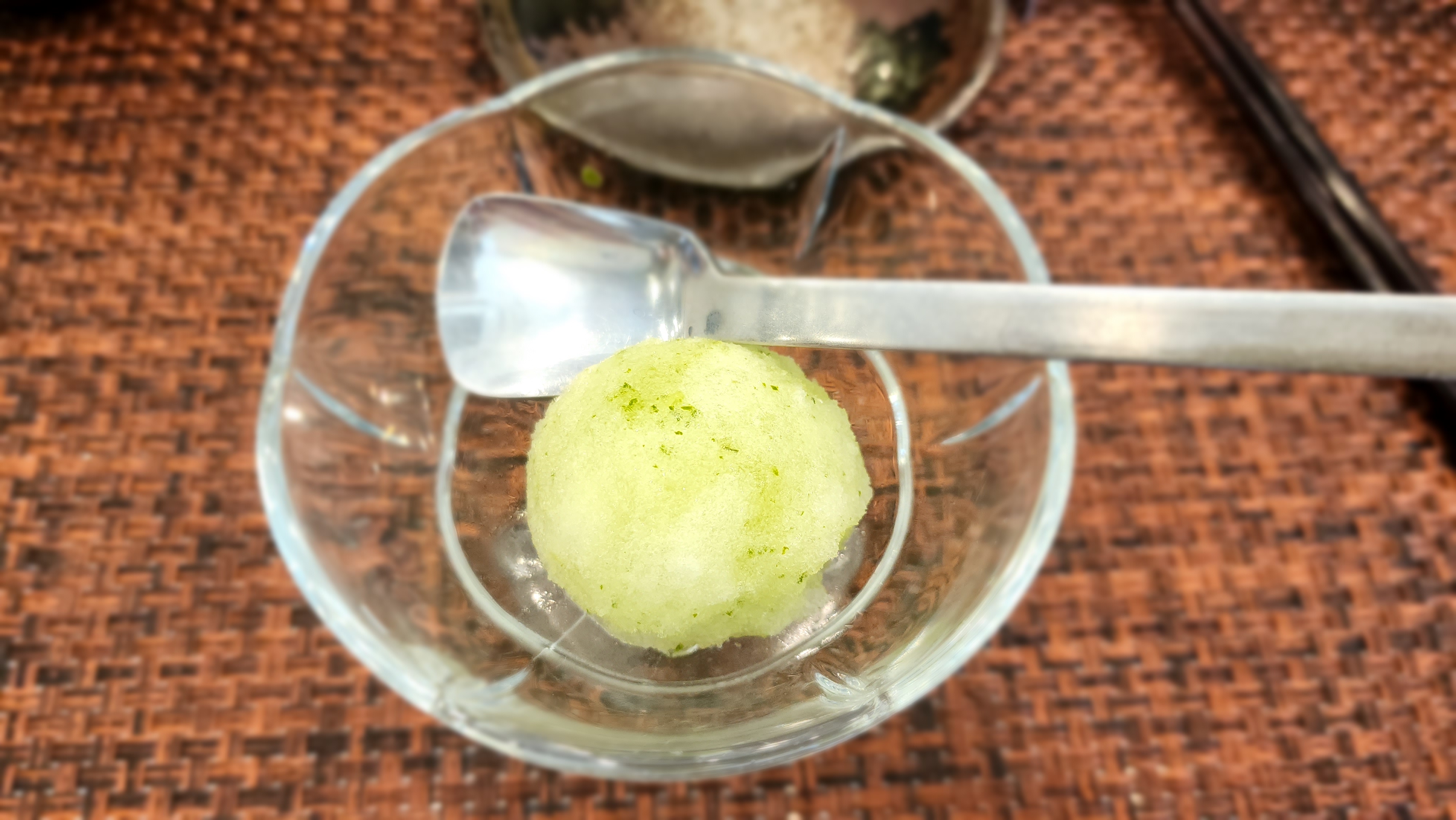 바질 셔벗. 중간중간 안 갈린 얼음이 나와서 아쉬웠다.