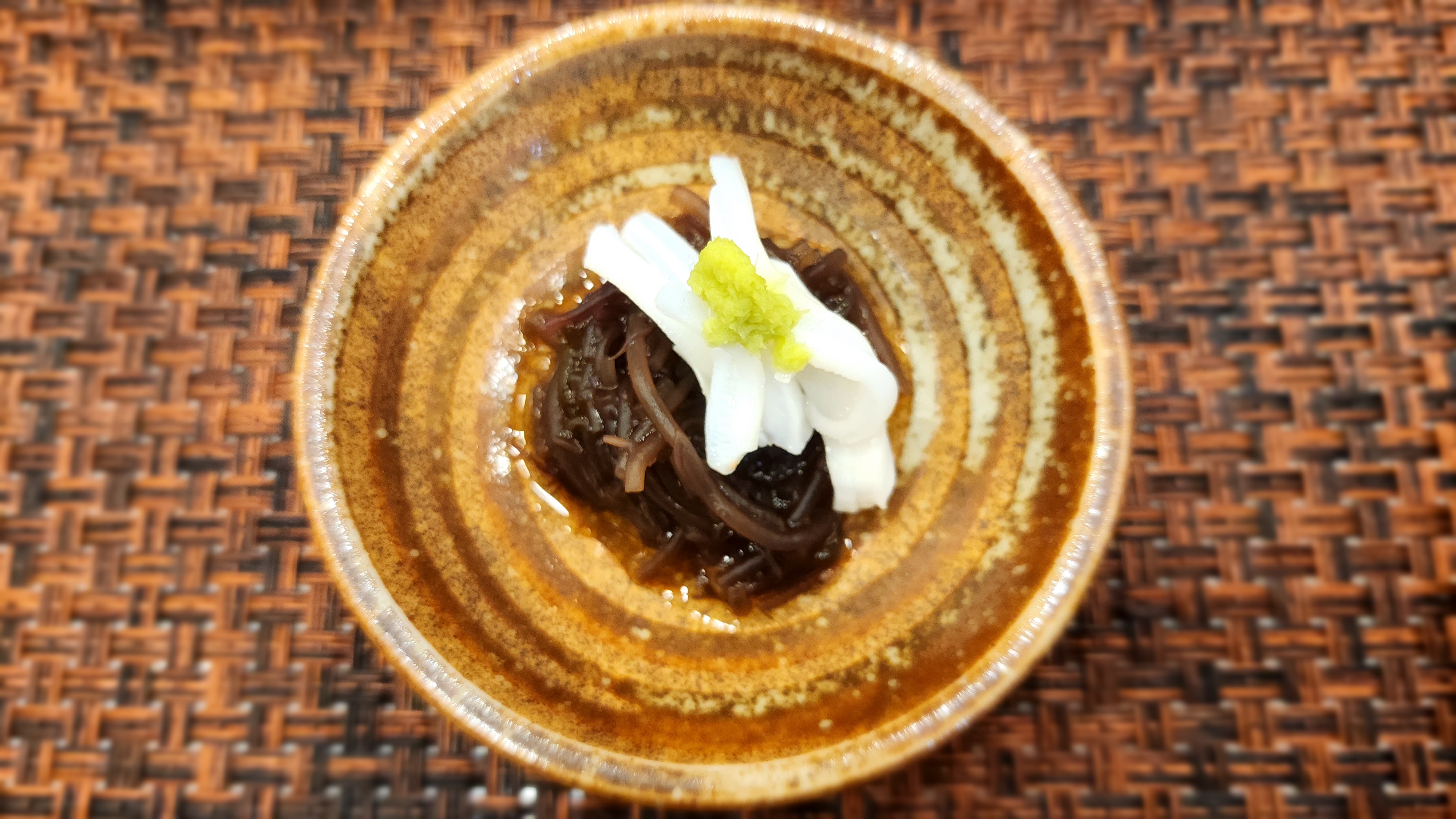 얇게 썬 한치. 아래 우뭇가사리와 함께 마시듯 한 입에.