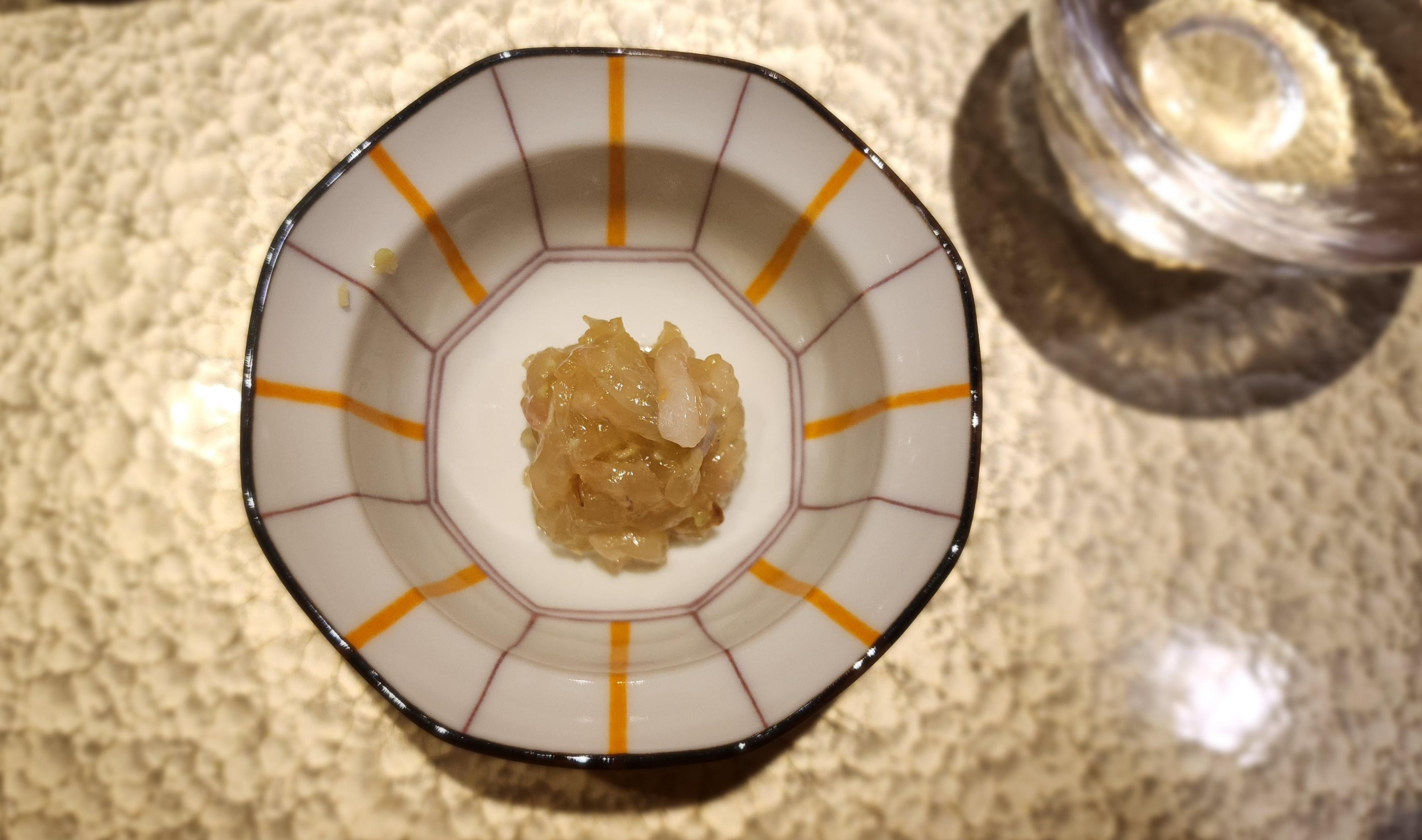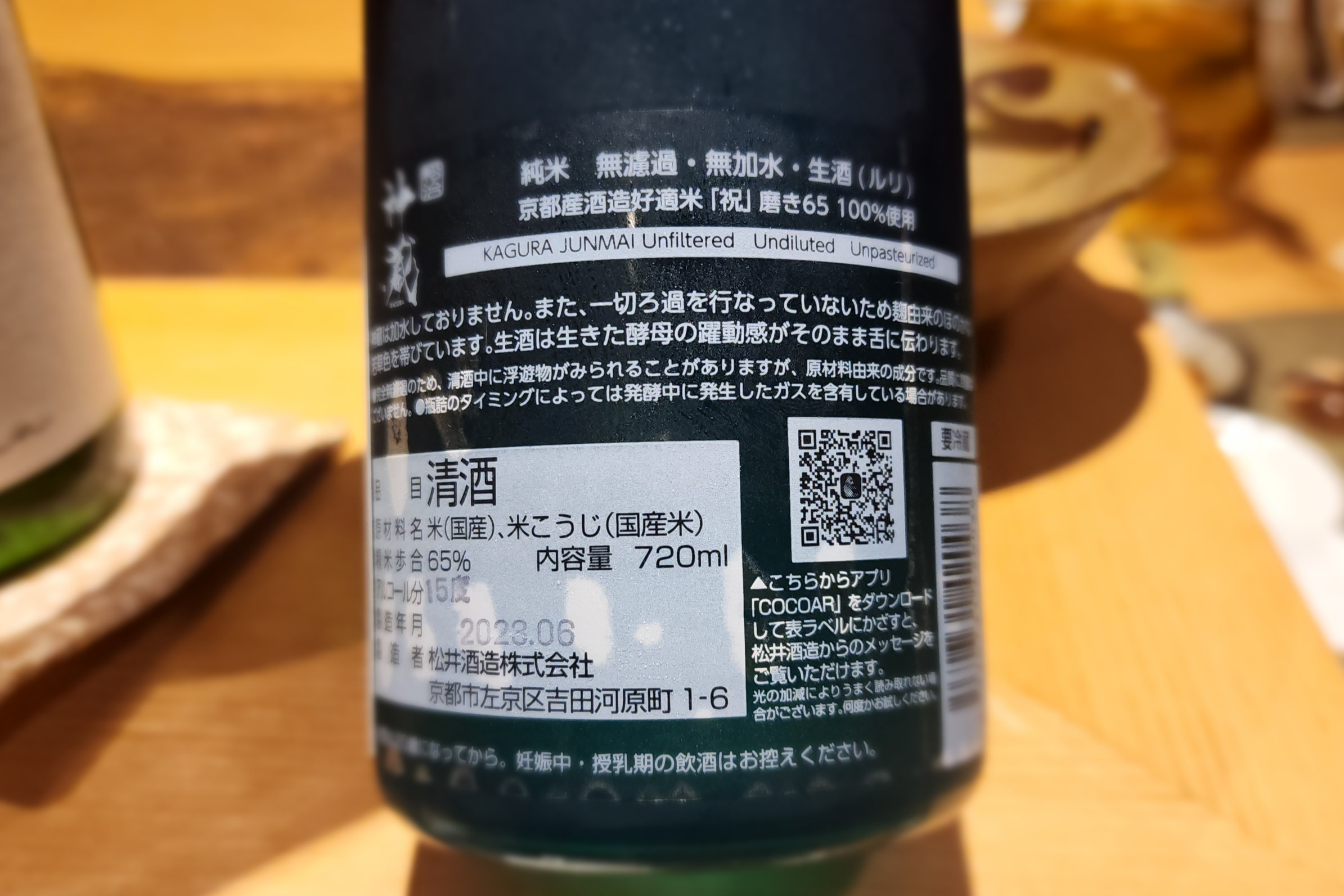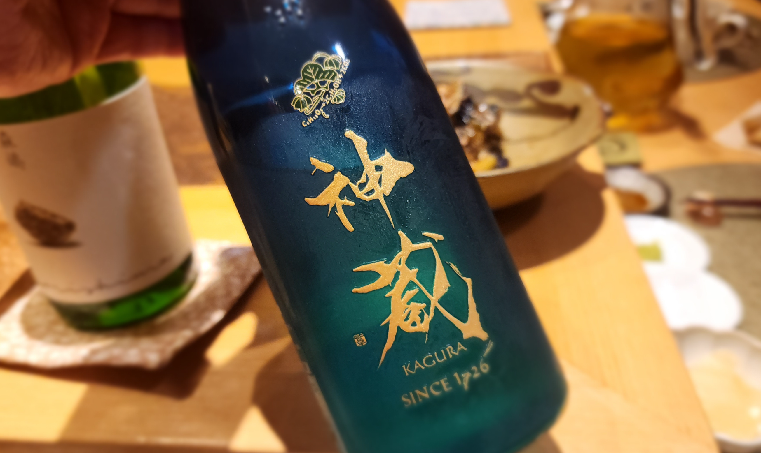여기서 사케 한 병 추가. 마쓰이 슈조 카구라 준마이 루리(松井酒造, 神蔵 純米 ルリ). 두 병을 추천해 주셨는데 더 비싼 걸로 달라고 했더니 이걸 주셨다ㅋㅋㅋ