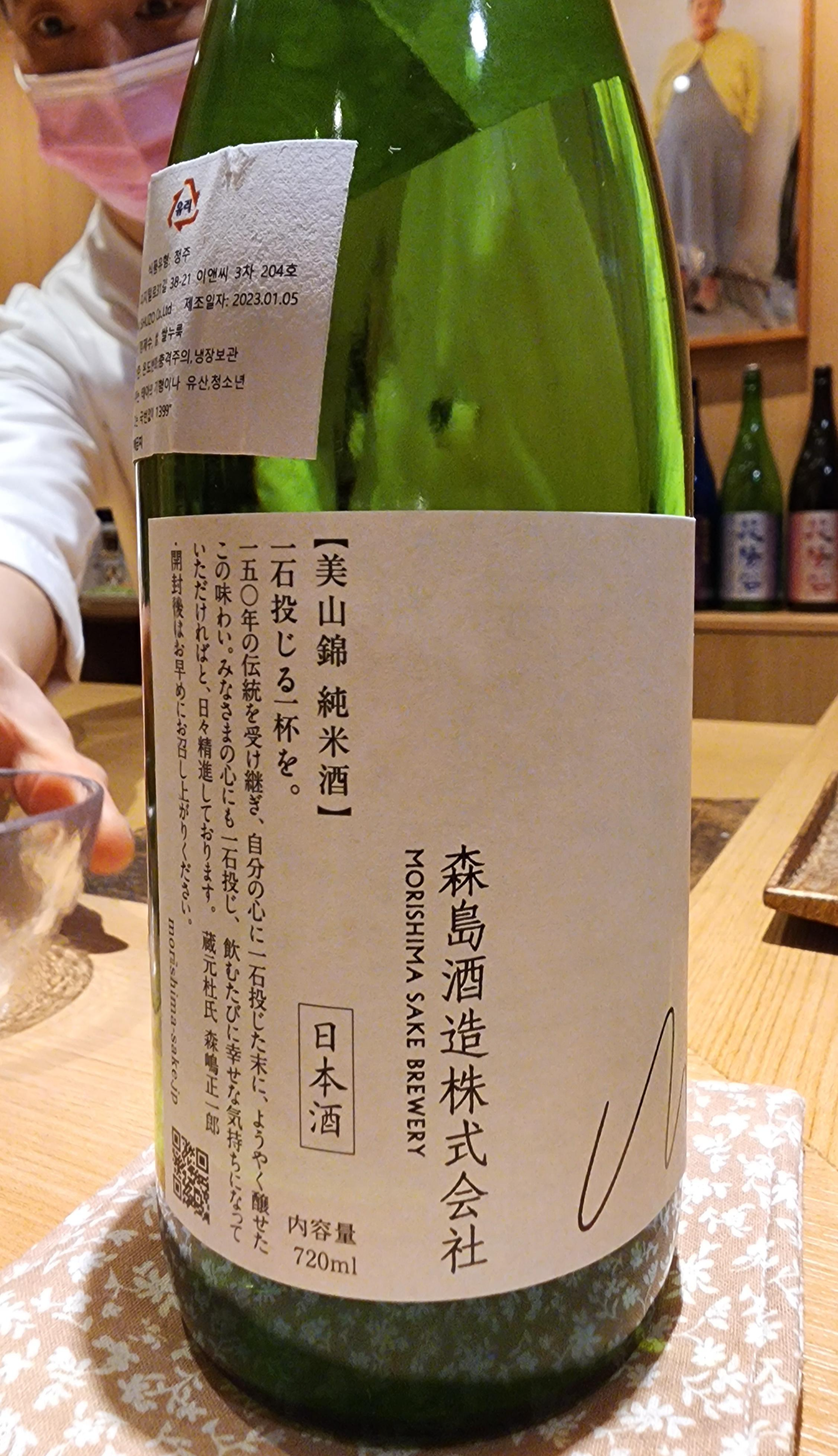 두 번째 사케, 모리시마 미야마니시키 준마이 빙칸히이레(森嶋, 美山錦 純米酒 瓶燗火入).