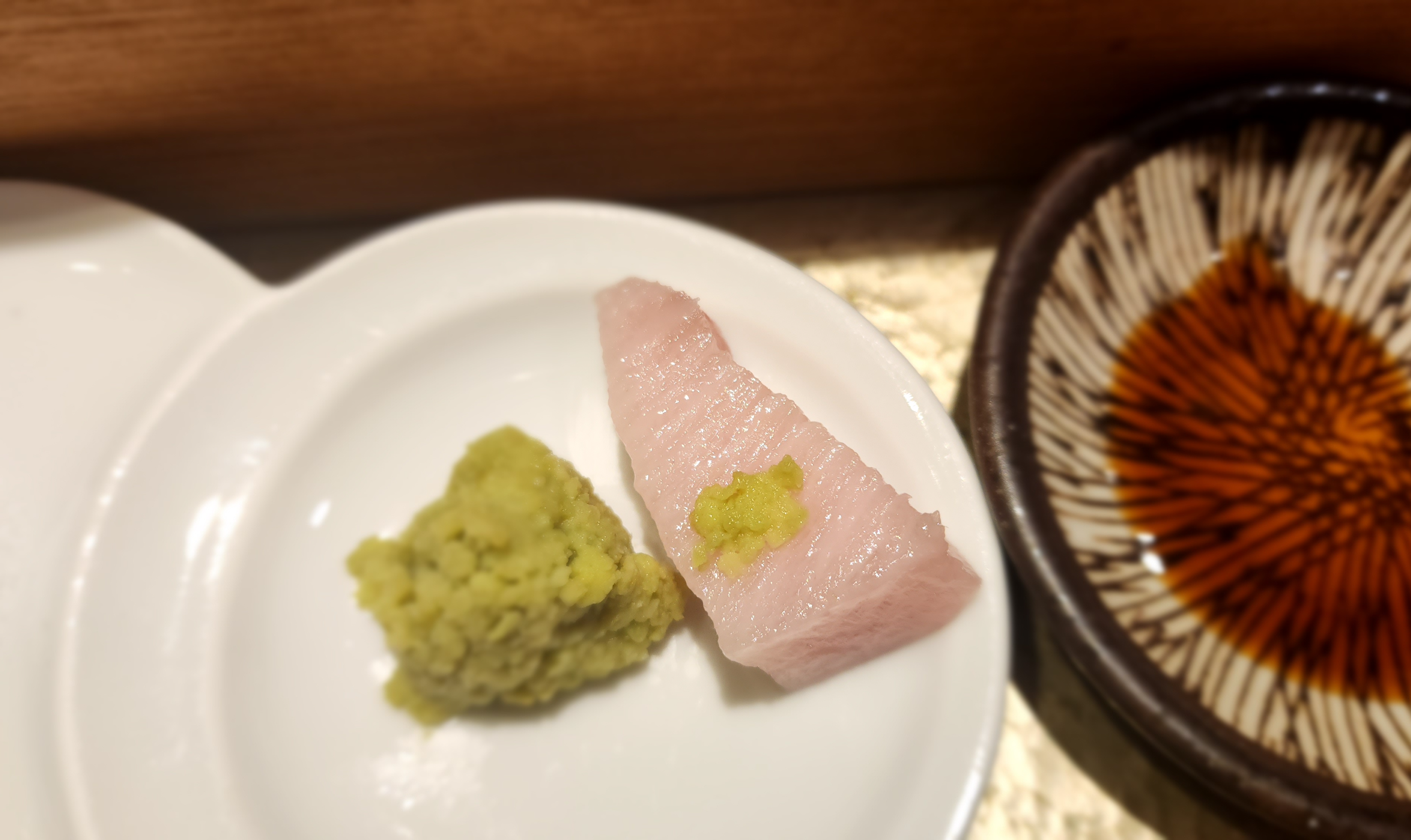아까미. 요건 와사비를 많이 올려 먹는 게 좋다고 아예 올려서 주셨다.