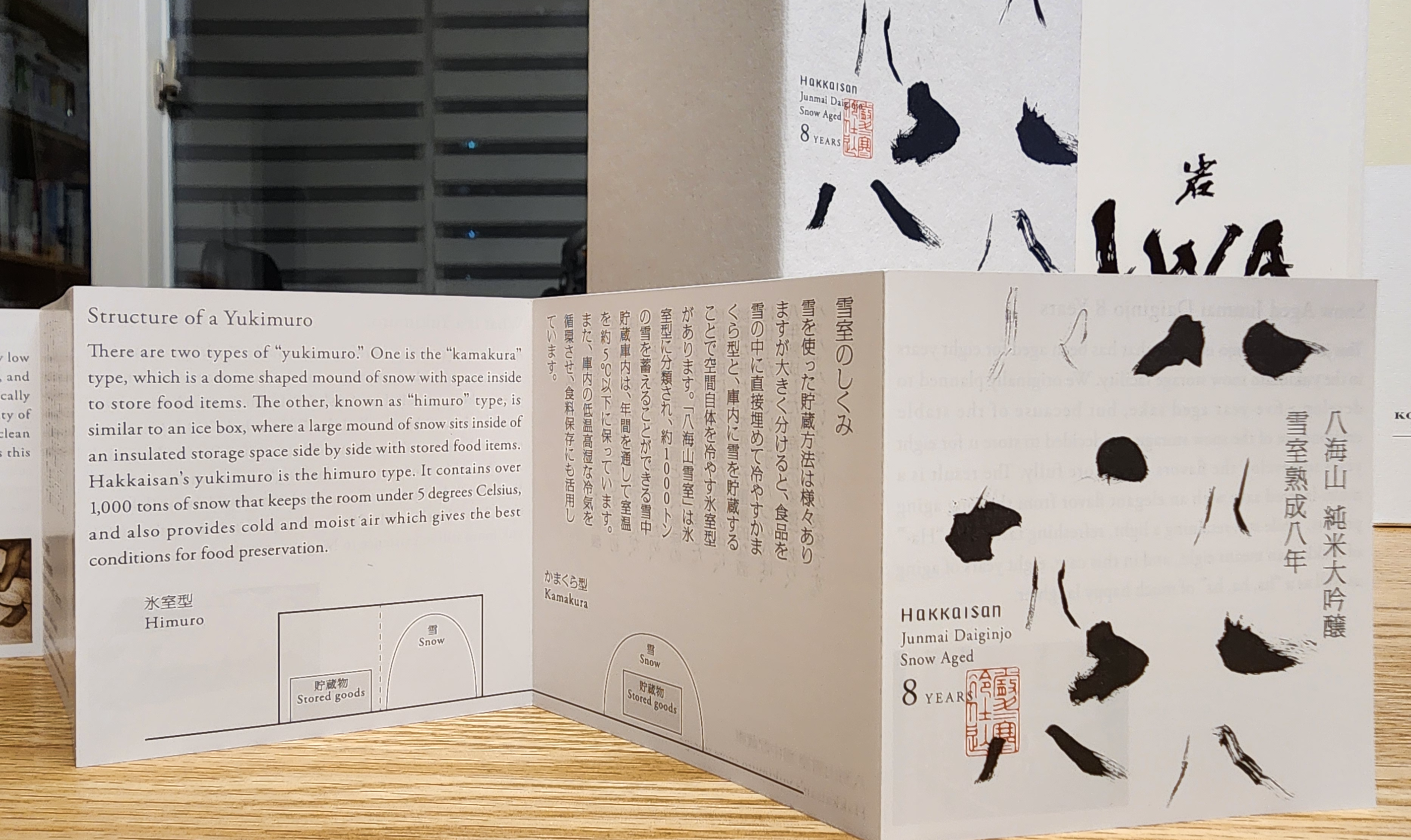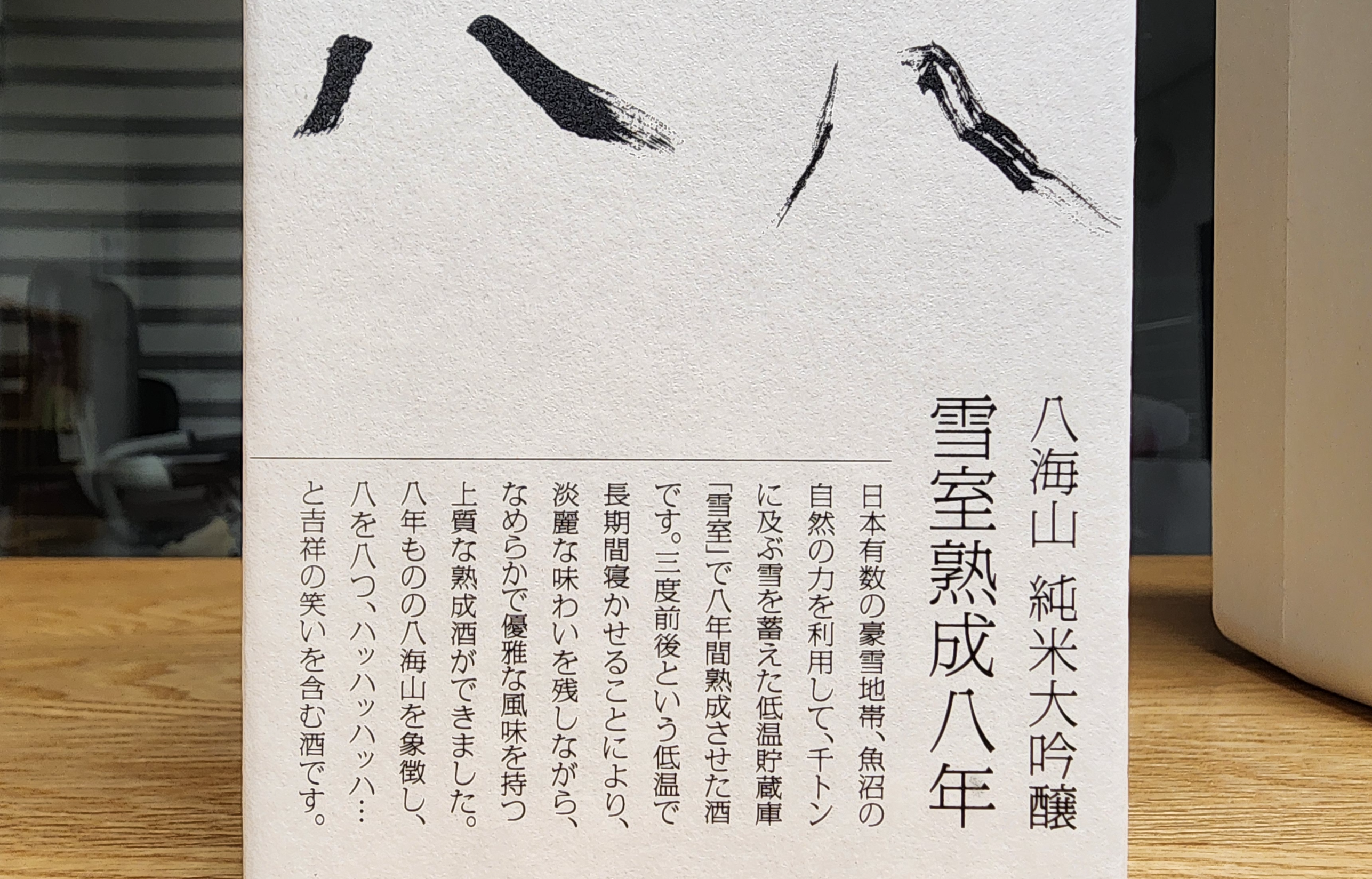 Snow Aged Junmai Daiginjo 8 Years. 원래는 5년 숙성 사케를 만들려고 했는데 보관 환경이 너무 좋아서 8년으로 늘렸다. 덕분에 가볍고 신선한 맛을 유지하면서도 다층적이고 우아한 풍미를 지닌 사케를 만들 수 있었다. 핫카이산의 첫 글자도 8이고, 숙성 년수도 8인데, 일본어로 8의 발음이 [ha]에 가까우므로 즐거운 웃음을 표현한다고 할 수도 있다고ㅋ