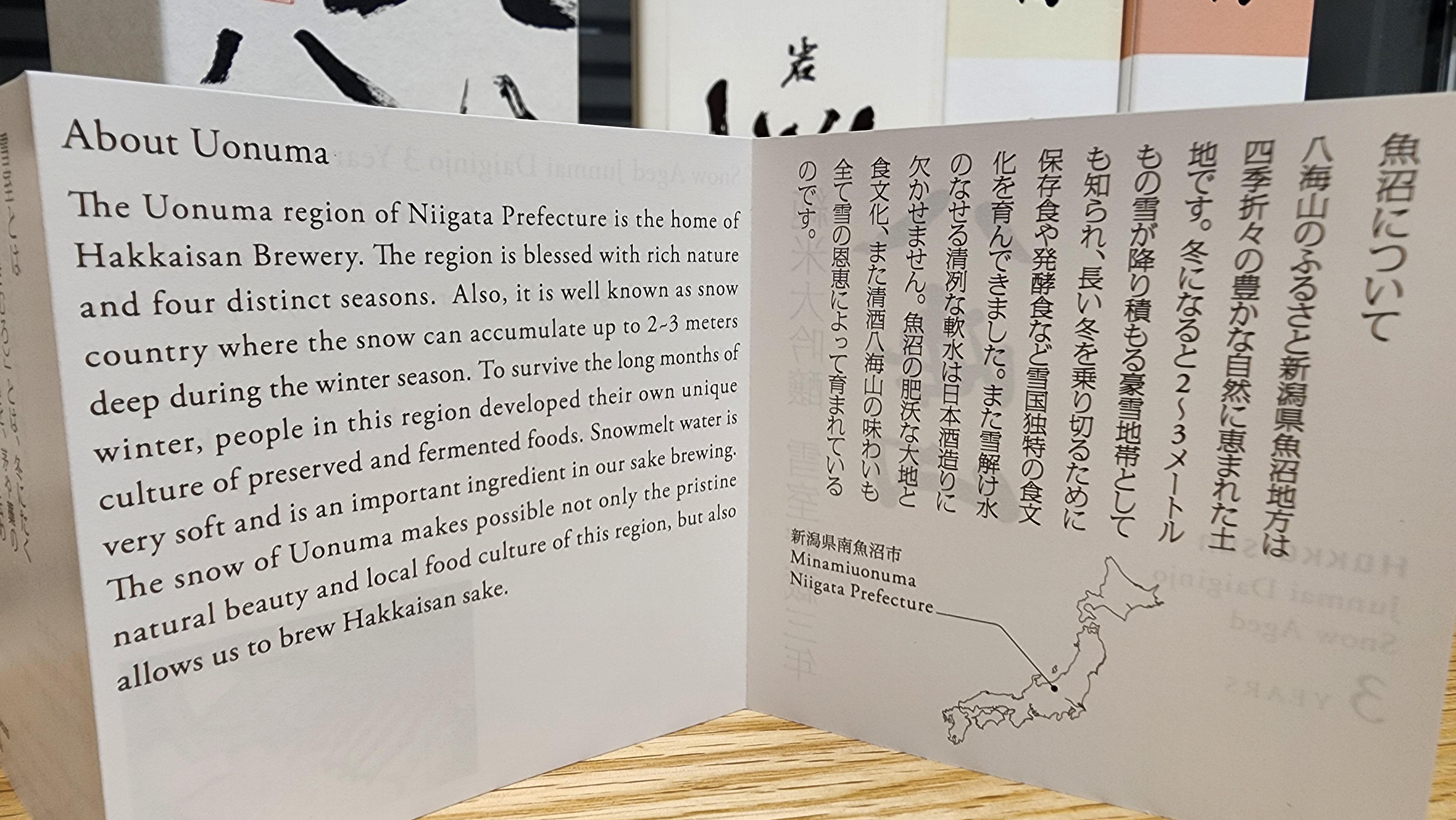 핫카이산을 만드는 핫하이슈조(八海釀造)는 니가타 남동쪽 우오누마(魚沼)에 있다. 이곳은 겨울이면 2~3m의 눈이 내릴 정도로 눈이 흔한 고장이다. 때문에 이 고장 사람들은 눈 속에서 살아남는 다양한 노하우를 익혔다. 자연스럽게 관련 음식 문화도 발전했으며, 녹은 눈이 만드는 맑은 물은 깨끗한 사케를 만드는 핵심 재료가 되었다.