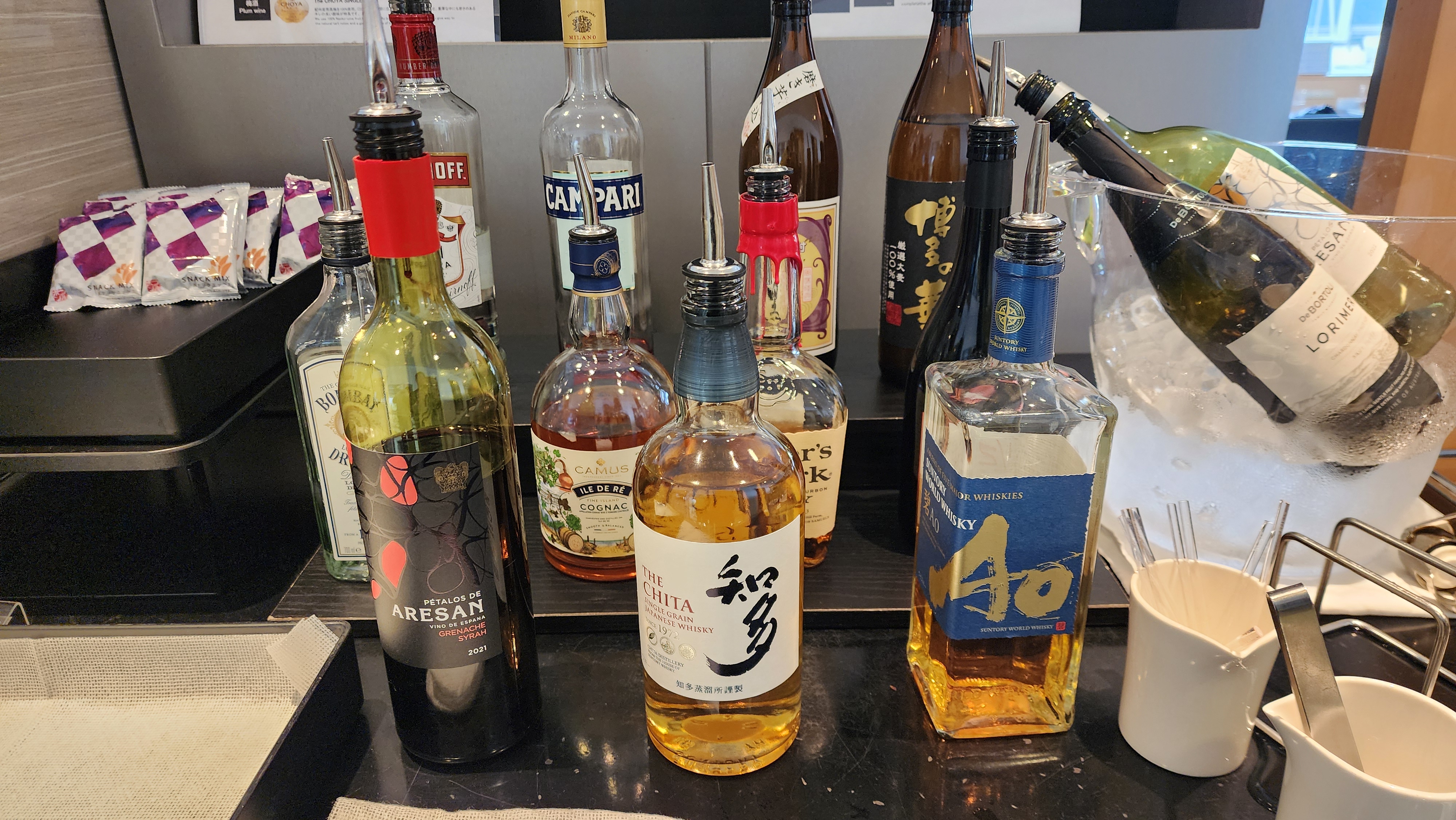 그리고 주류 리스트. 생맥주는 기린과 아사히가 있었던 것 같고, 사케도 한 종류 있었는데 자세히 보지는 않았다. 와인은 완연한 엔트리 레벨이라 마시지 않았고. 아침이라 술을 많이 마시긴 부담이 있었기에 식사를 하며 치타(知多) 하이볼을 마셨고, 경험하지 못한 위스키와 코냑을 온 더 락으로 맛만 봤다.