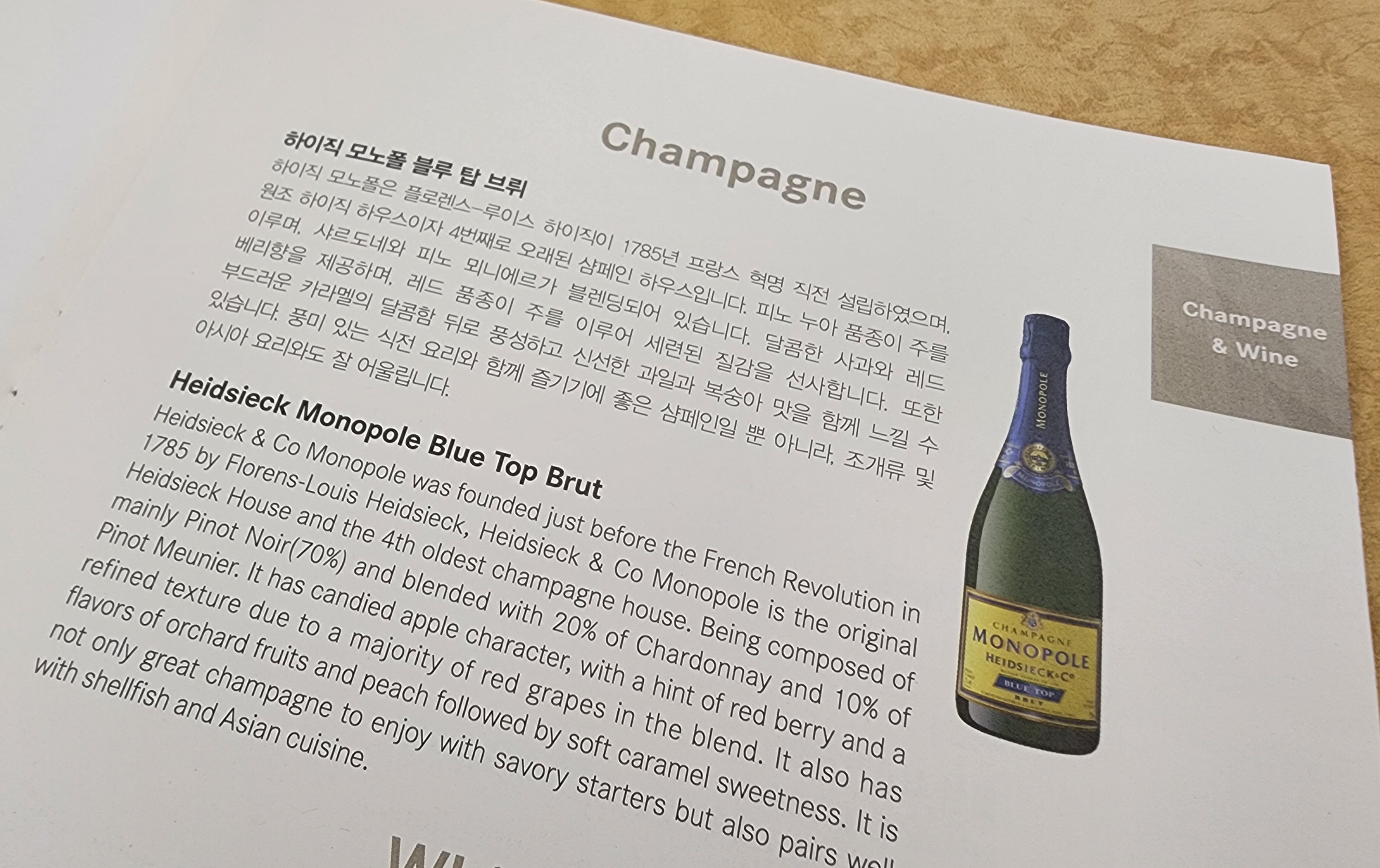 어쨌거나 선택지는 샴페인뿐. Champagne Monopole Heidsieck & Co. Blue Top Brut. 그리 선호하는 샴페인은 아니지만 그래도 이게 어디냐...