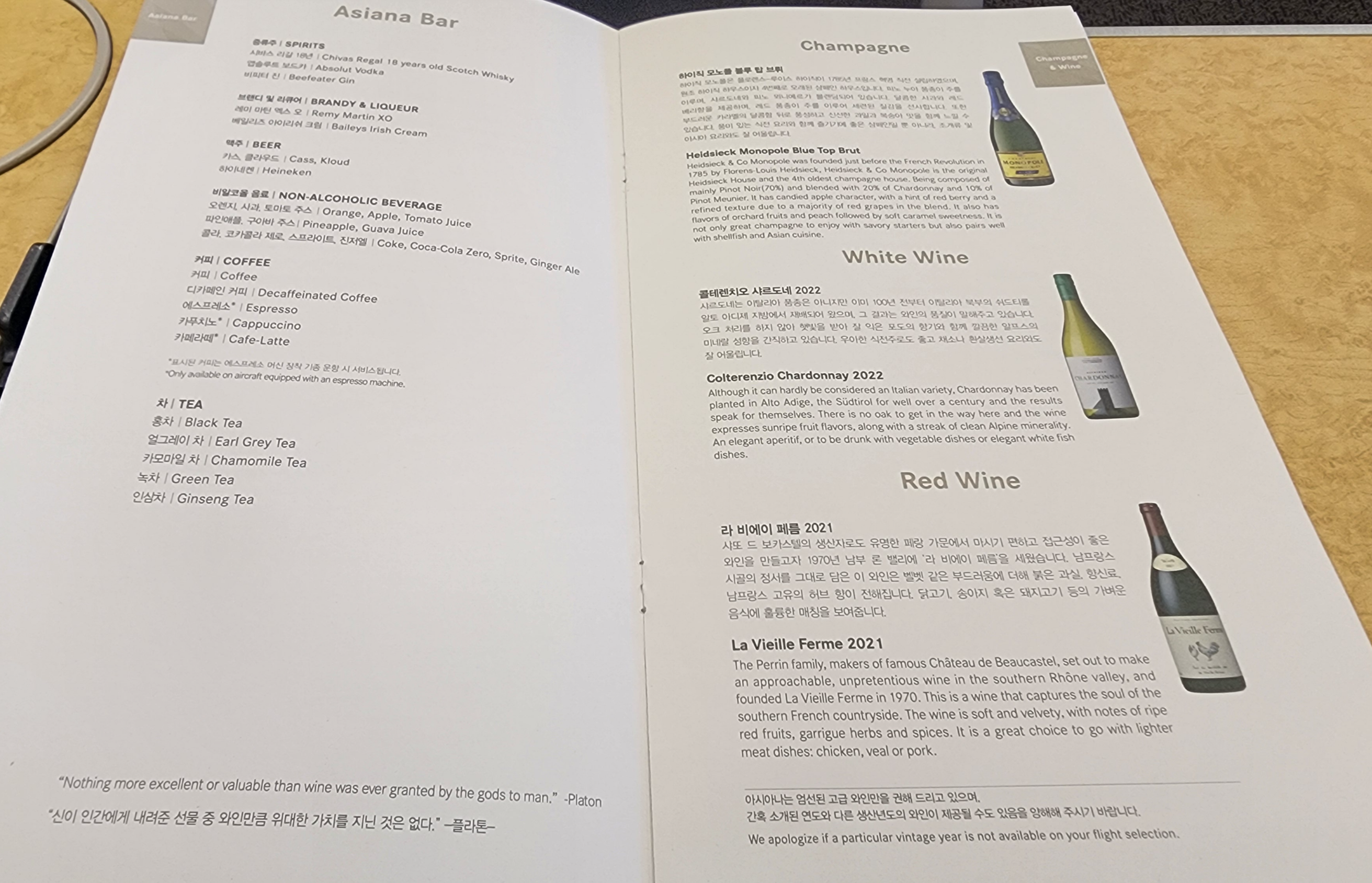 와인 리스트도. 샴페인은 그렇다 치고 화이트와 레드 와인은 눈을 의심할 수밖에 없었다. La Vieille Ferme은 가성비 좋은 맛있는 와인이긴 해도 비즈니스 클래스에 나올 와인은 아니지 않나? 와인 좀 아는 사람이라면 실소가 나오지 않을 수 없는 리스트다. 게다가 아래에는 '엄선된 고급 와인만'을 제공한다는 문구가 버젓이 쓰여 있다. 하. 하. 하.