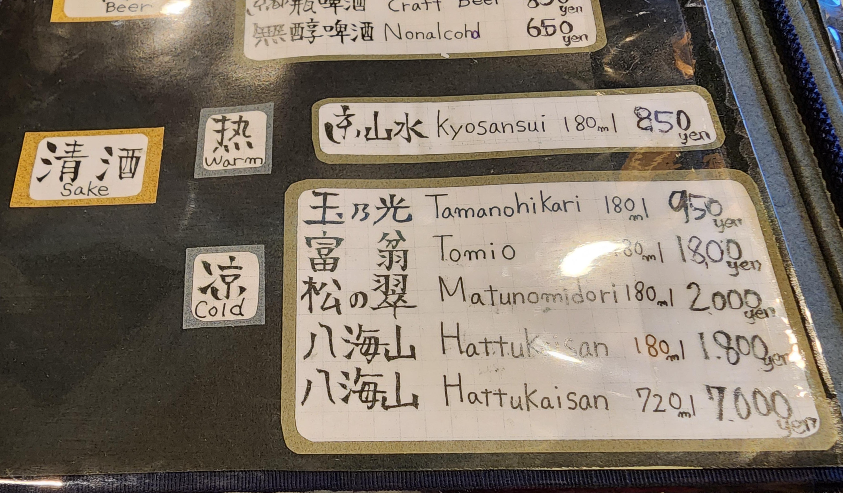 당연히 사케를 한 잔 마실 생각으로 살펴봤는데 브랜드만 안내할 뿐 어떤 술인지 자세히 설명하진 않는다. 이왕이면 처음 보는 걸 마셔보고 싶어서 마츠노미도리(松の翆)를 골랐다.