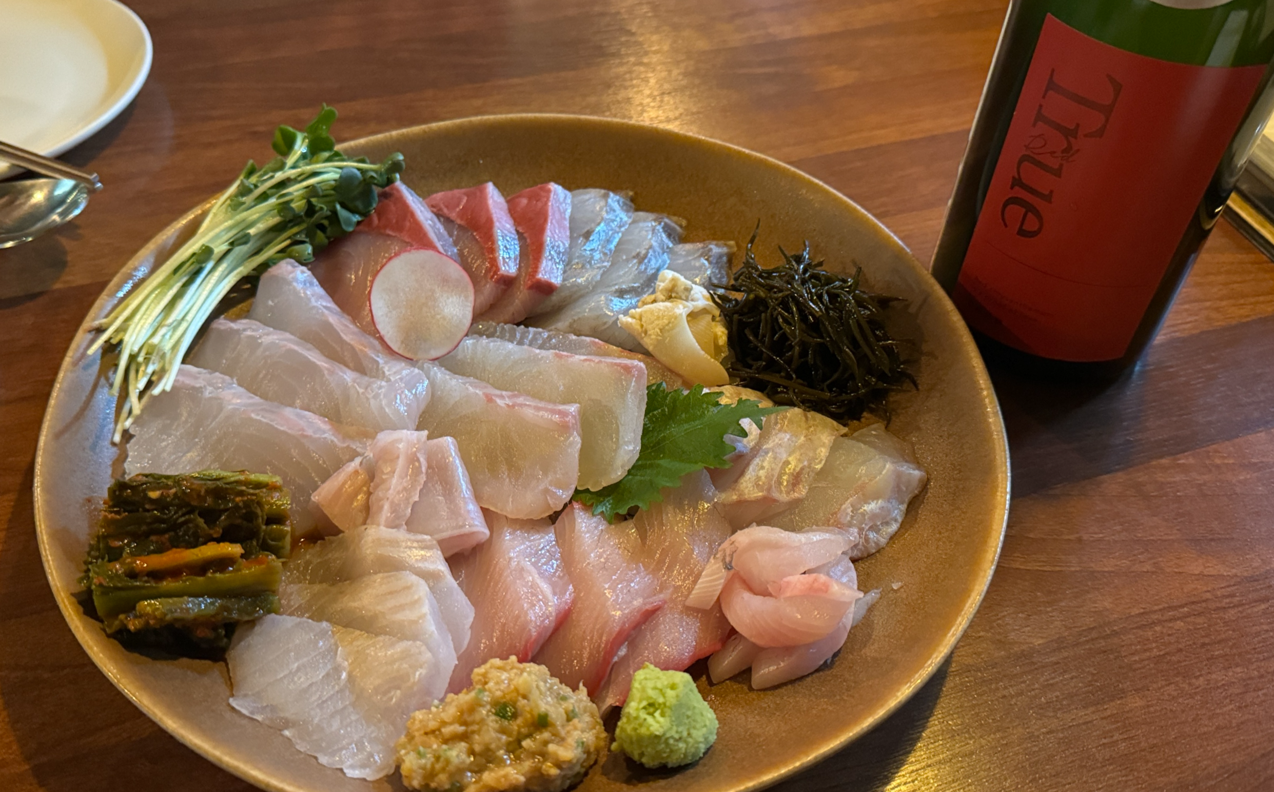 와, 감탄을 연발하며 마셨던 사케. 왜 요즘 뜨는지 알 것 같다. 잘 숙성한 모둠회와도 너무 잘 어울렸다.