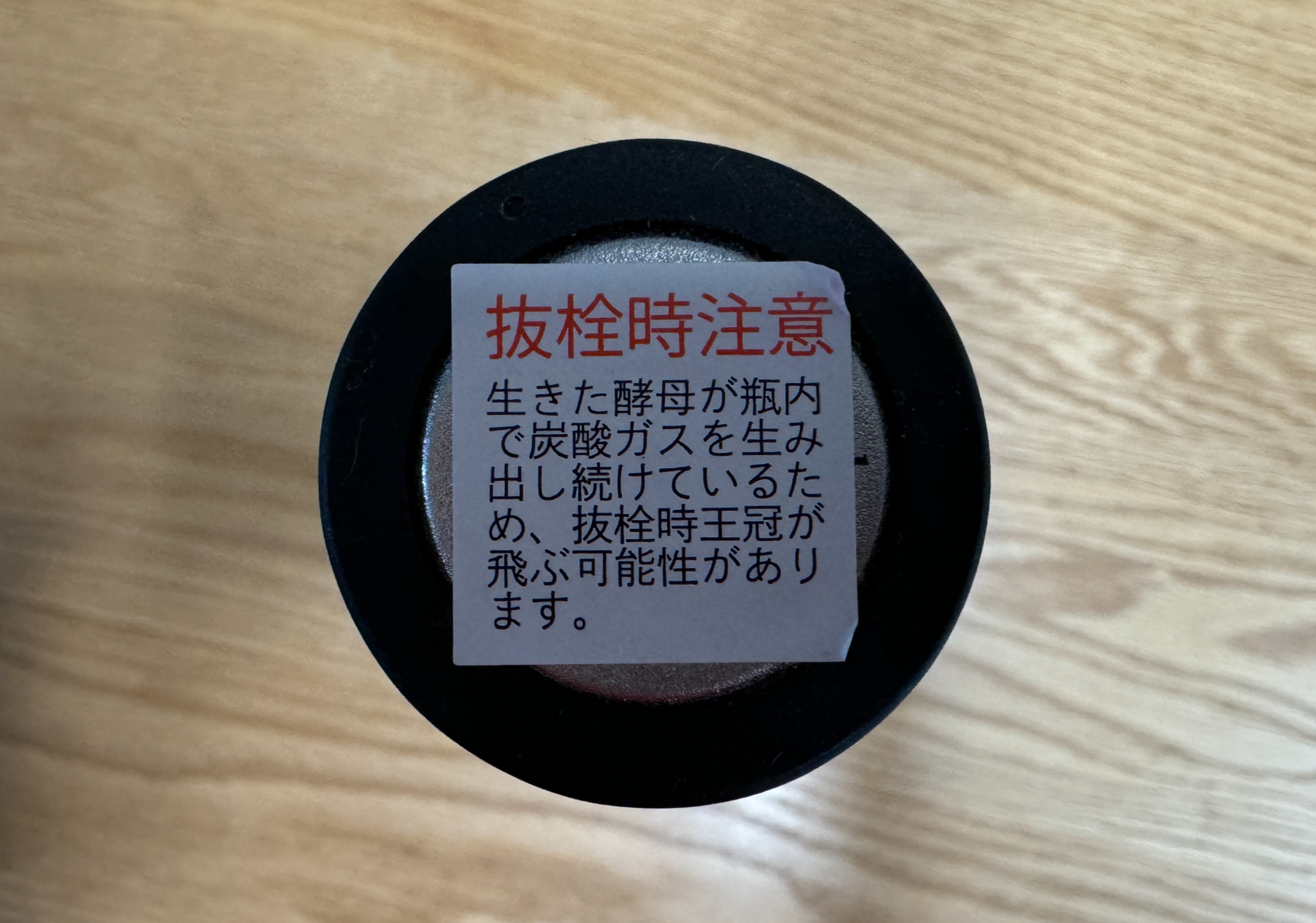 마개 위에는 주의 문구 스티커가 붙어 있다. 살아 있는 효모가 계속 발효하며 탄산을 만들고 있기 때문에 오픈할 때 마개가 날아갈 수 있으니 조심하라는 것. 샴페인 오픈하듯 윗부분을 잘 잡고 오픈해야 할 것 같다. 그런데 실제 오픈해 보니 날아갈 기미조차 보이지 않더라는 ㅋㅋㅋㅋ 케바케인 것 같다.