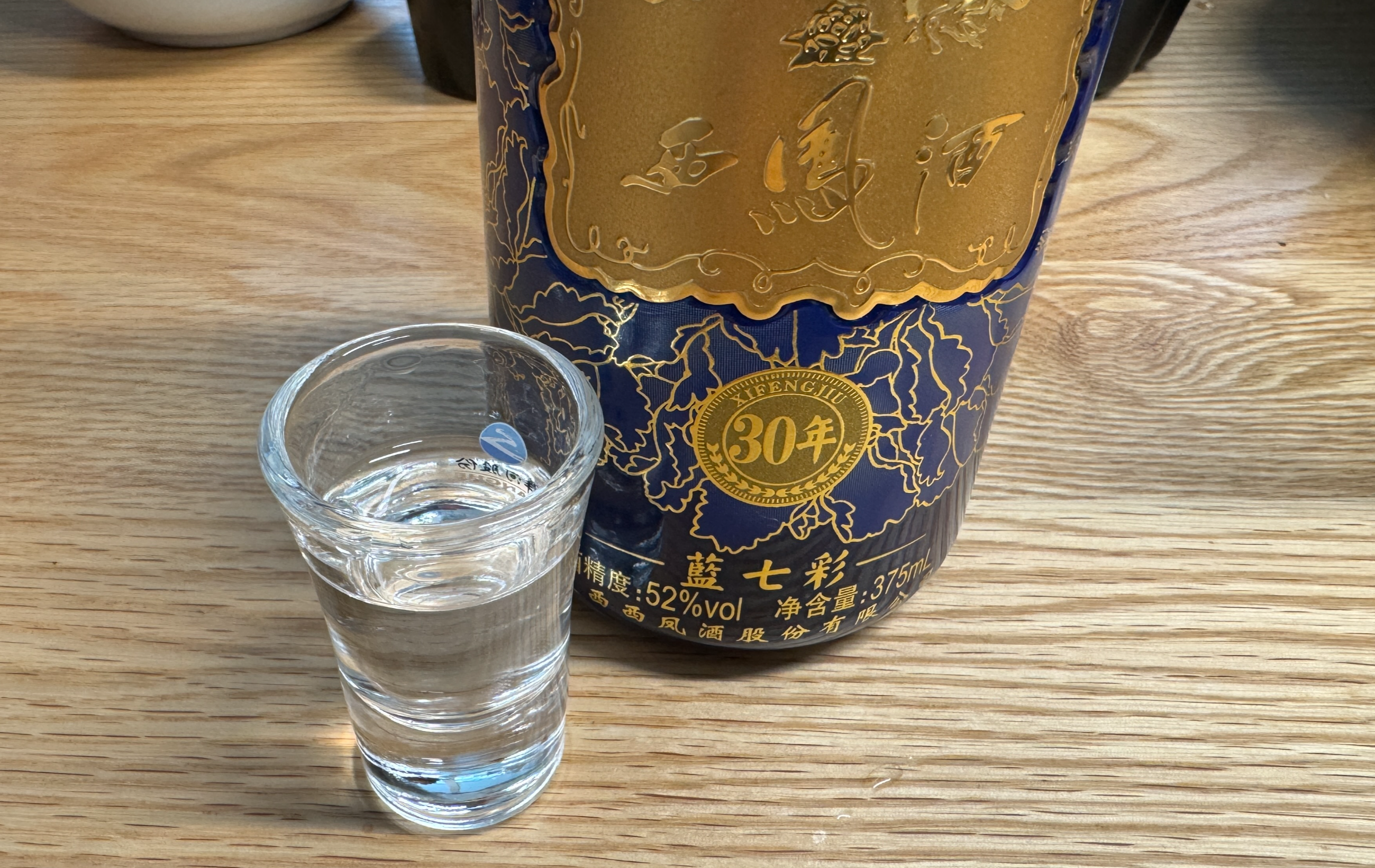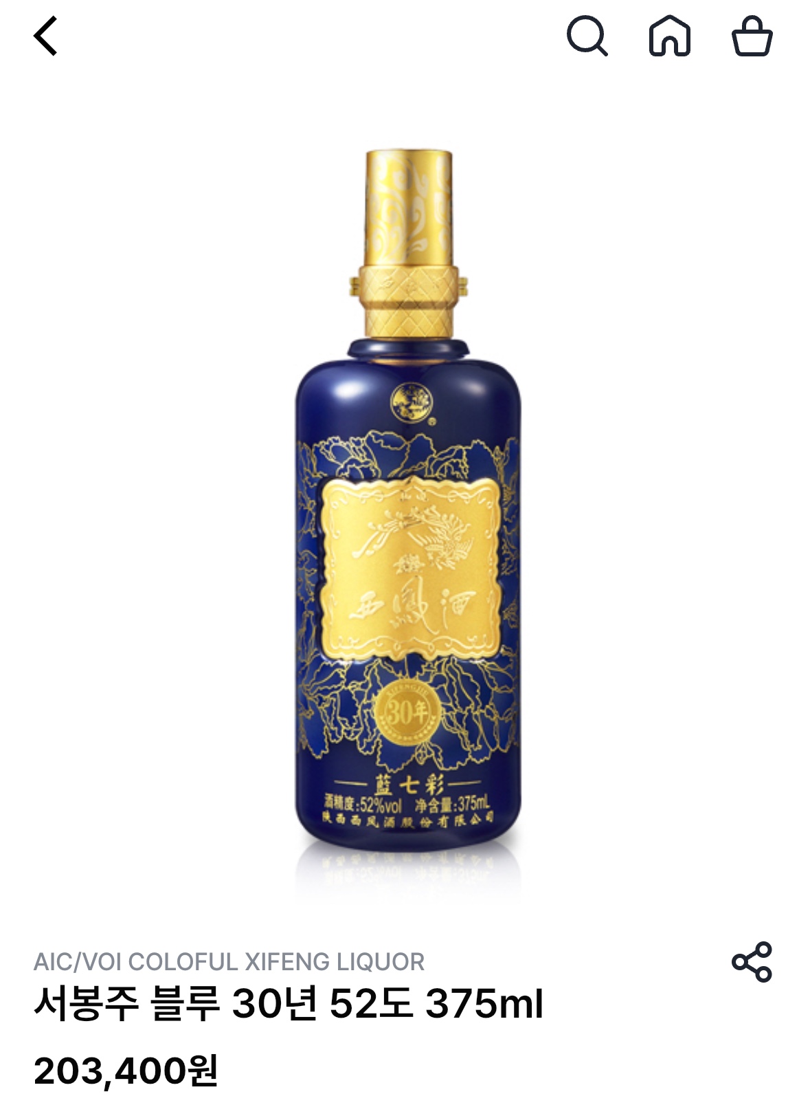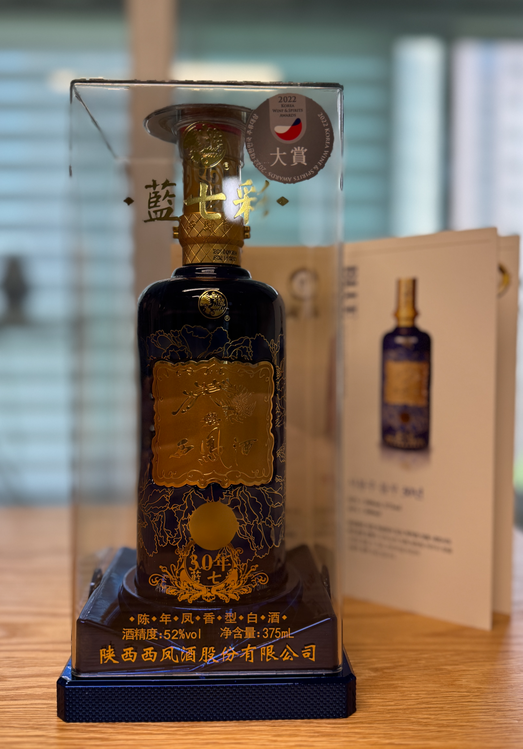 서봉주 블루 30년(西鳳酒 Gold 30年). 중국어 표기는 '西凤酒 藍七彩 30年이다.