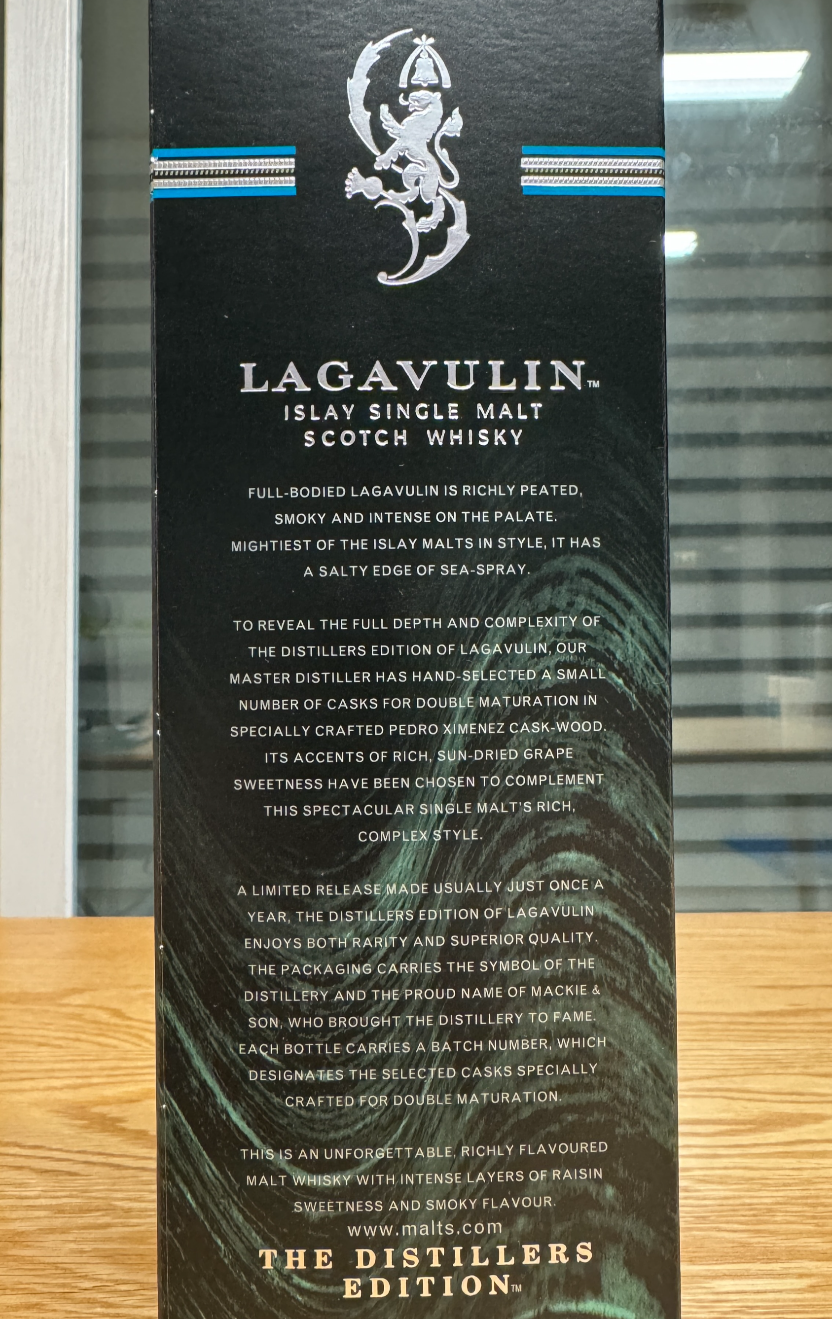 디스틸러스 에디션은 디아지오(Diageo)의 클래식 증류소들에서 매년 출시하는 스페셜 에디션이다. 라가불린은 아드벡, 라프로익(Laphroaig)과 함께 소위 '아일라 피트 3대장'이라고 불리는 증류소. 그중에서 가장 선이 굵으면서도 온화한(?!) 피트 뉘앙스를 풍기는 것으로 유명하다.