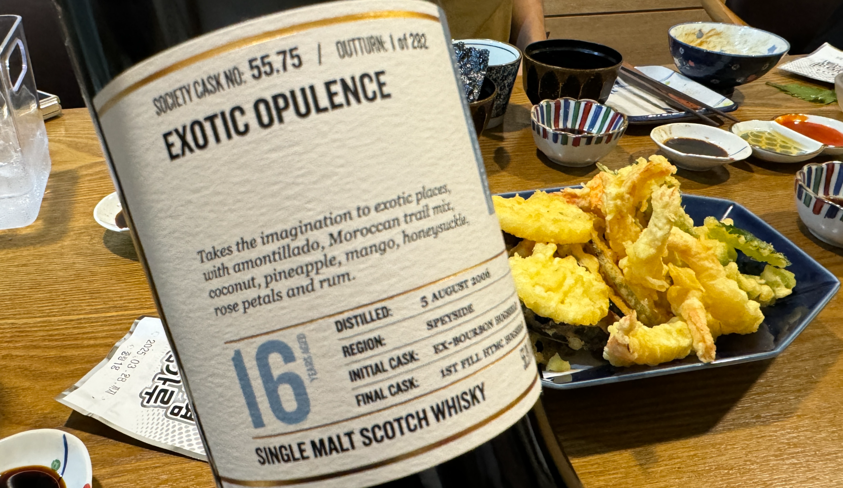 마지막 위스키는 SMWS, Exotic Opulence(no: 55.75, 16 yo). Royal Bracla 증류소의 위스키다. 말린 무화과와 진한 핵과 풍미, 드라이 오크, 톡 쏘는 스파이스와 토스티 뉘앙스. 숙성 연수에 비해서는 알코올이 높고, 높은 알코올에 비해서는 생각보다 타격감이 강하지 않다. 시간이 지날수록 더욱 멜로우해지는 느낌에 달콤한 피니시 또한 매력적이다.
