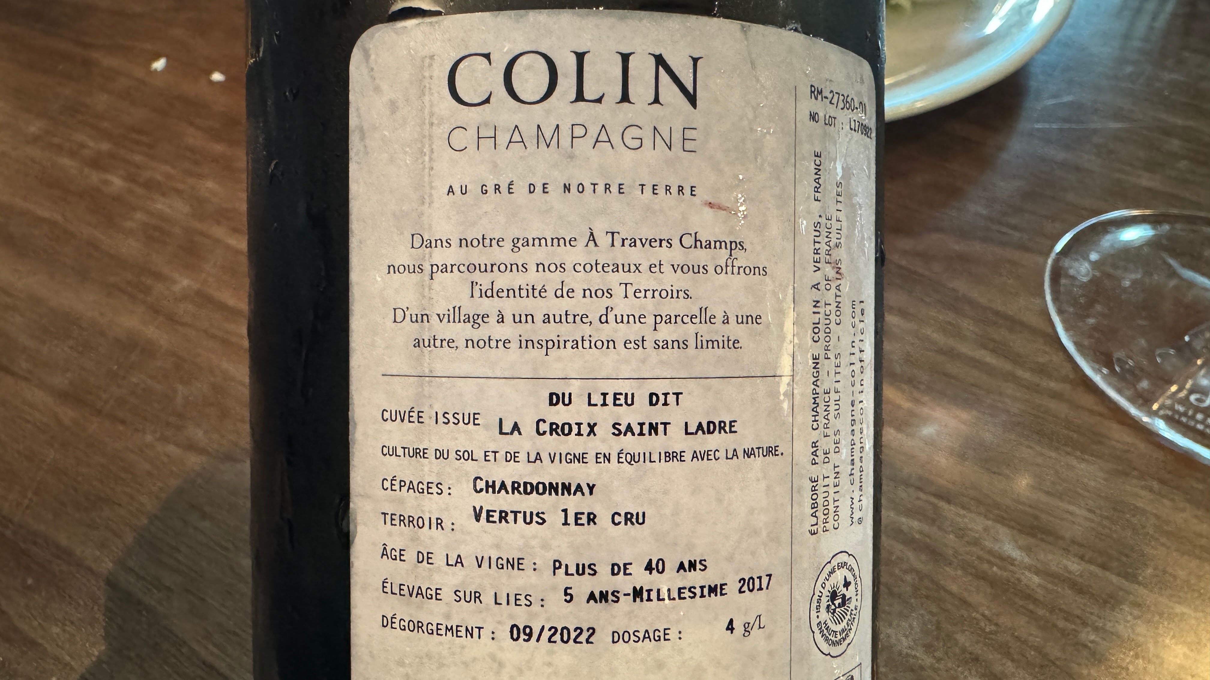 꼬뜨 데 블랑(Cotes des Blancs)의 프르미에 크뤼 베르튀스(Vertus)의 리외디(lieu dit) 라 크루아 생 라드르에서 재배한 40년 이상 수령의 샤르도네만 사용해 스테인리스 스틸 탱크에서 발효 및 젖산발효 했다. 병입 후 5년 정도 숙성해 2022년 9월 데고르주멍을 진행했다. 도자주는 리터 당 4g. 눈에 뜨이면 또 사고 싶은 와인이다.