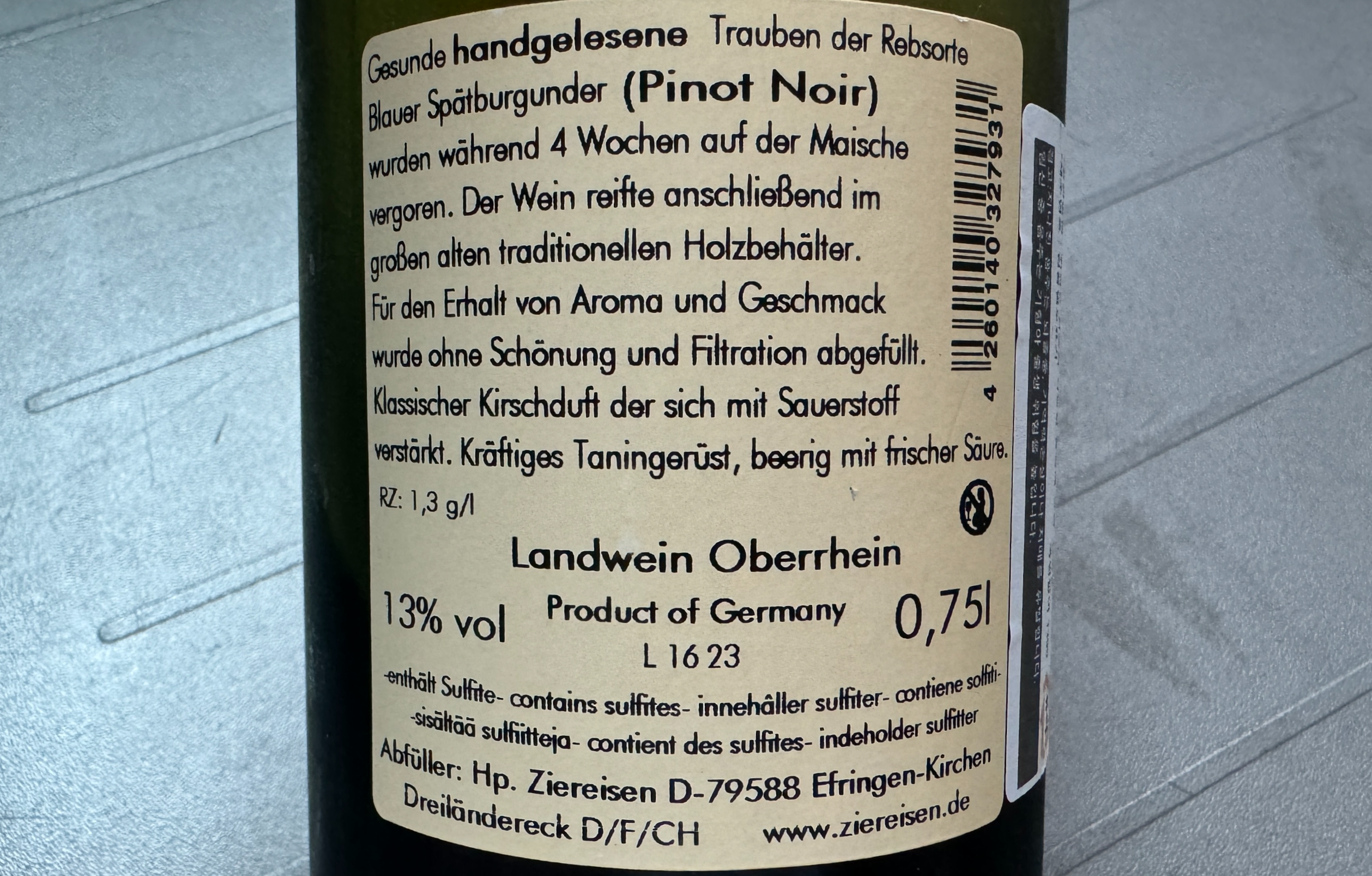 수확한 포도를 파쇄해 4주 동안 침용 및 발효 후 전통적인 커다란 나무통에서 숙성한다. 레이블 하단에 어퍼 라인 지역에서 만든 란트바인(Landwein Oberrhein)이라고 적혀 있는 게 의외다. 일반적으로 피노 누아는 크발리테츠바인(Qualitätswein) 등급으로 만들어지니까. 확인해 보니 치어라이젠은 1971년 재정된 독일의 와인법에 비판적이다. 때문에 엄격한 테이스팅을 거쳐야 하는 크발리테츠바인등급을 거부하고 란트바인 등급으로 와인을 출시하는 거라고 한다.