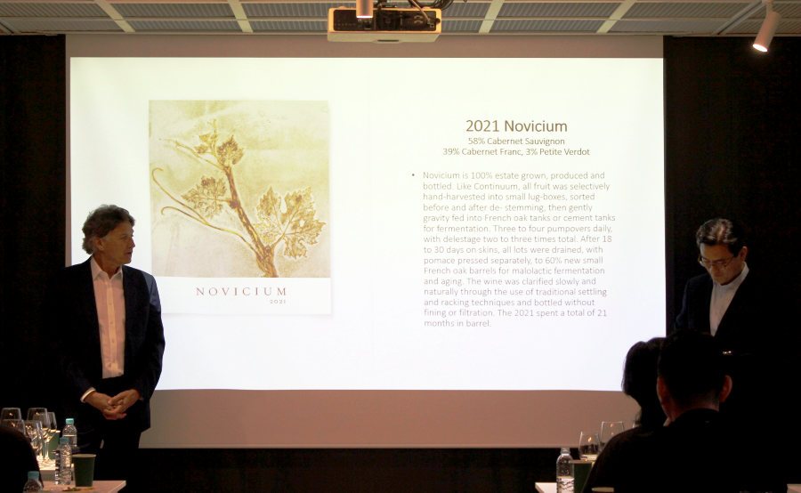 먼저 컨티뉴엄의 세컨드 와인 노비시엄을 시음했다. 노비시엄에 사용되는 포도와 양조 방식은 컨티뉴엄과 완벽히 동일하다. 각 포도 품종들은 세심하게 선별해 작은 박스에 손으로 수확한다. 이후 줄기를 제거하고 가볍게 파쇄해 중력으로 시멘트 탱크와 프렌치 오크 배럴로 옮겨 발효한다. 18일에서 30일 정도 껍질과 접촉하며 발효하는 동안 펌핑 오버(pumping over)는 하루에 3-4회, 델레스타주(delestage)는 총 2-3회 정도 진행한다. 이후 프렌치 오크 배럴에서 2021년 빈티지는 21개월, 2013년 빈티지는 22개월 숙성했다. 새 오크 비율은 각각 60%와 68%다. 이후 세심한 테이스팅을 거쳐 컨티뉴엄이 될 배럴들을 선택하는데, 컨티뉴엄이 되지 못한 배럴로 만든 것이 노비시엄이다. 'Novi'는 '익히다'라는 의미의 라틴어로, 노비시엄은 세이지 마운틴 빈야드에 대한 몬다비 패밀리의 높은 이해도를 반영하는 이름이다.