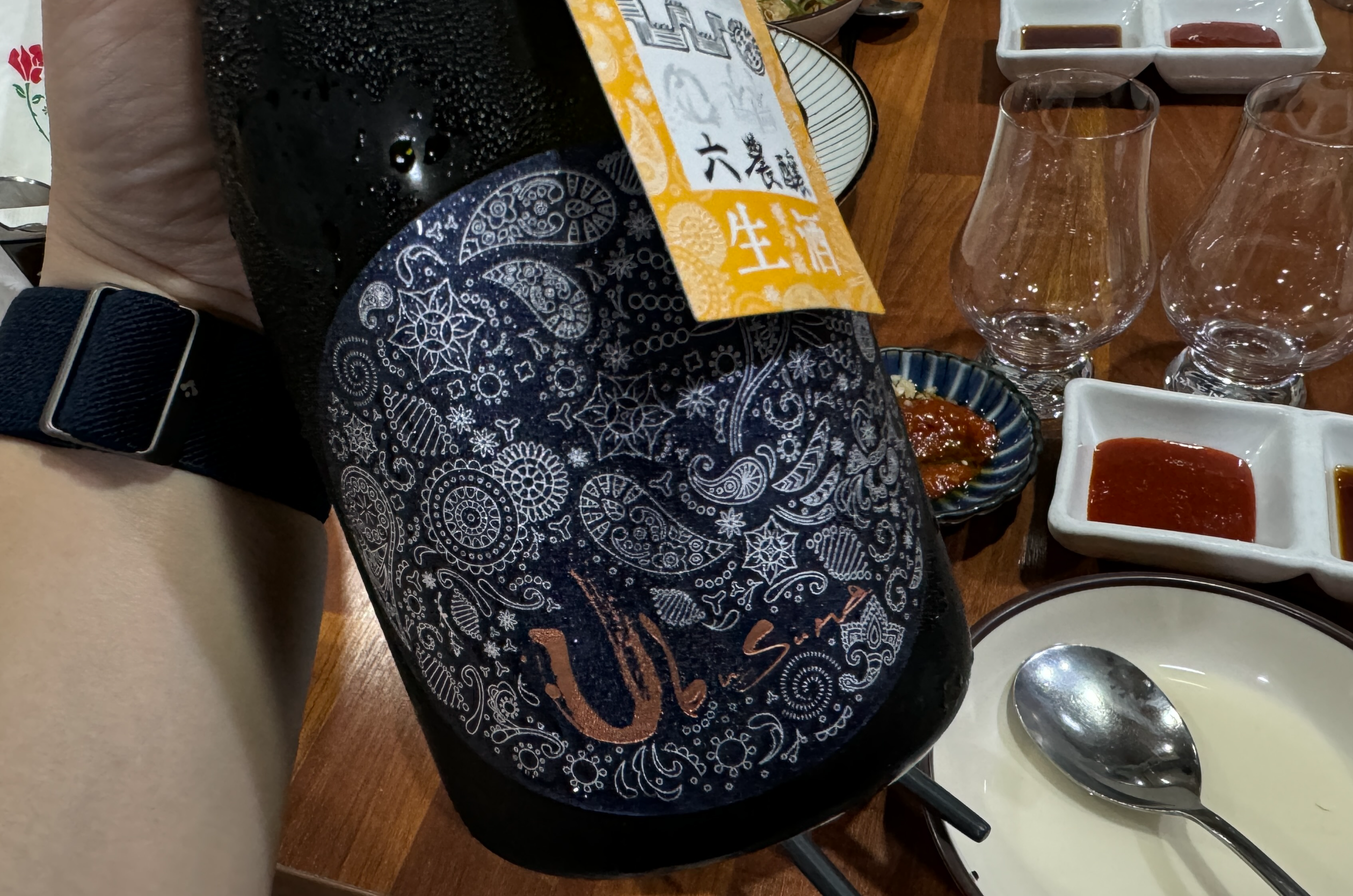 우부스나 야마다니시키 육농양 나마자케. 예상보다 더 달달하고 바디감이 있었는데, 미탄산이 신선함을 더해 주고 밸런스도 좋아서 전혀 부담스럽지 않았다. 회와도 잘 어우러지는 매력적인 사케다.