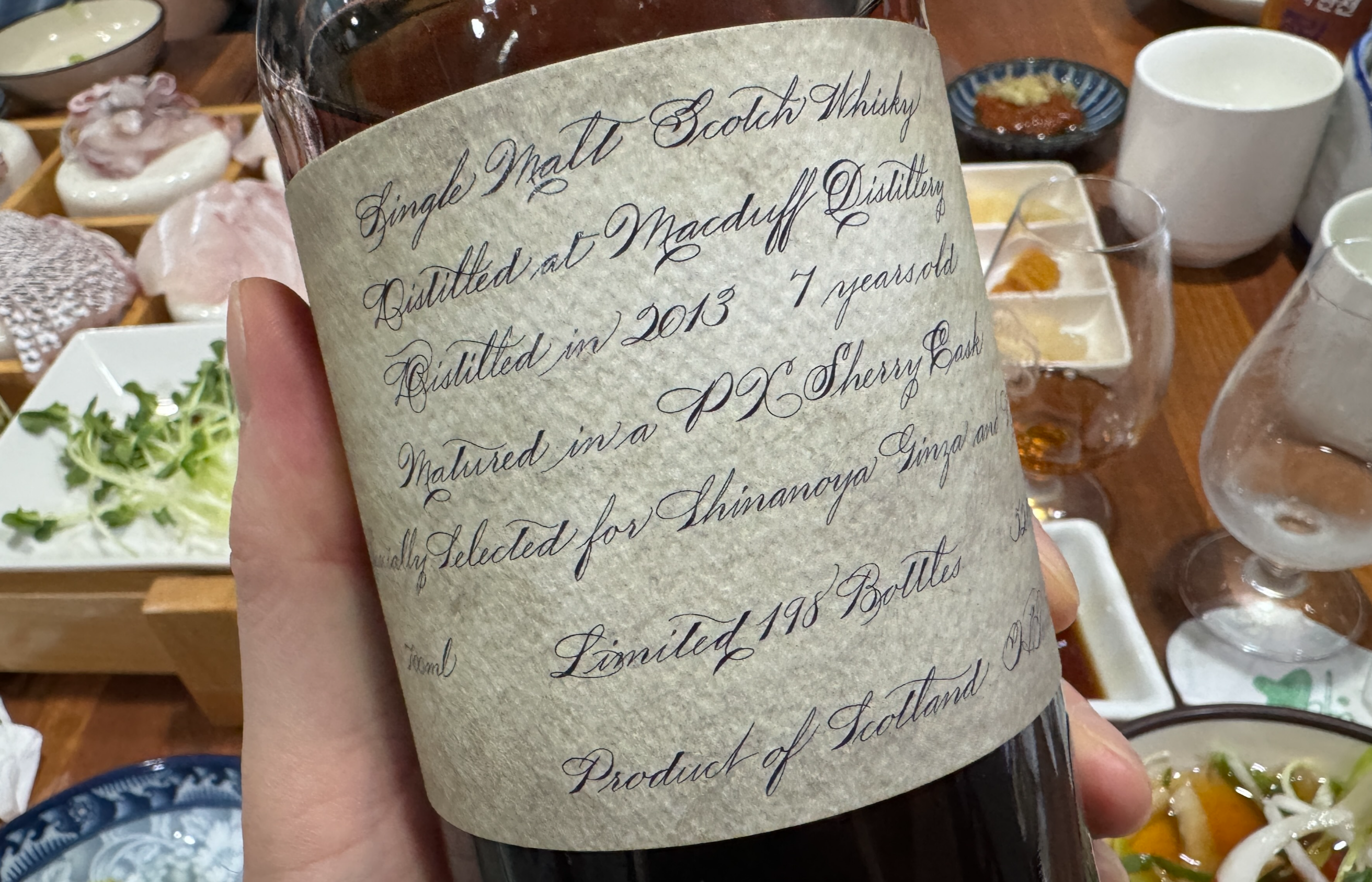 첫 위스키는 레이블이 화려(?)하다. Shinanoya, Macduff 2013 PX 7 yo. 구수한 너티 뉘앙스에 말린 베리, 입에서는 플로럴 허브. 끝끈하지 않은 흑당 느낌에 에나멜 힌트, 어린 만큼 타격감이 있지만 부담스럽진 않다. 뭔가 코냑스럽다(?)는 느낌도 받았다.