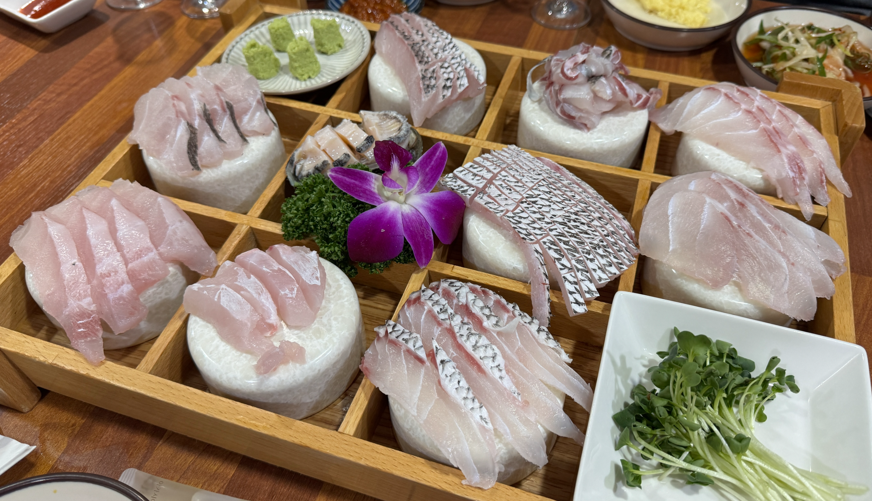 낚시로 잡아 살아 있는 민어를 서울로 올려 손질한 후 숙성했다고 한다. 그만큼 싱싱하게 잘 숙성됐다는 이야기. 확실히 맛있긴 하더라^^