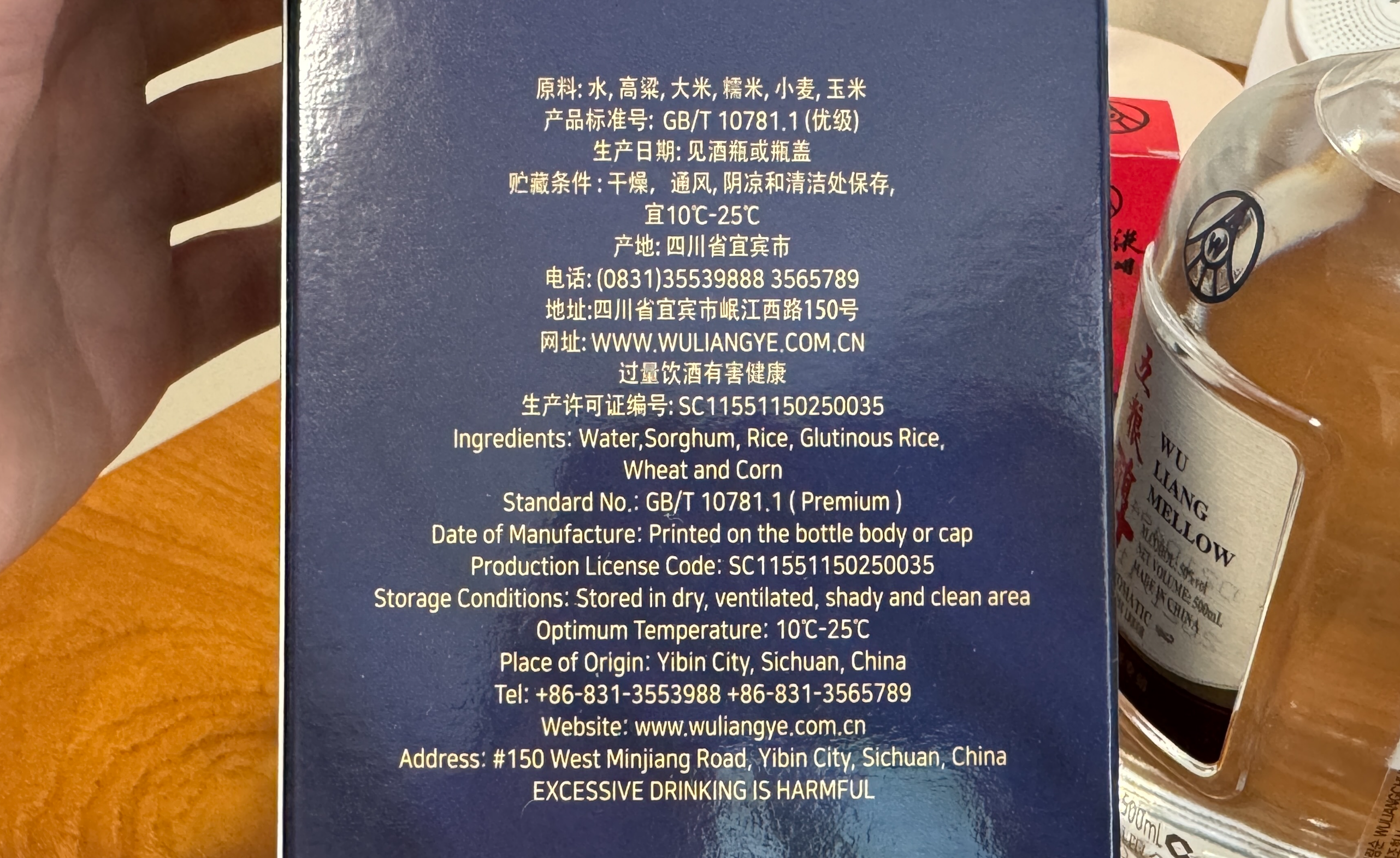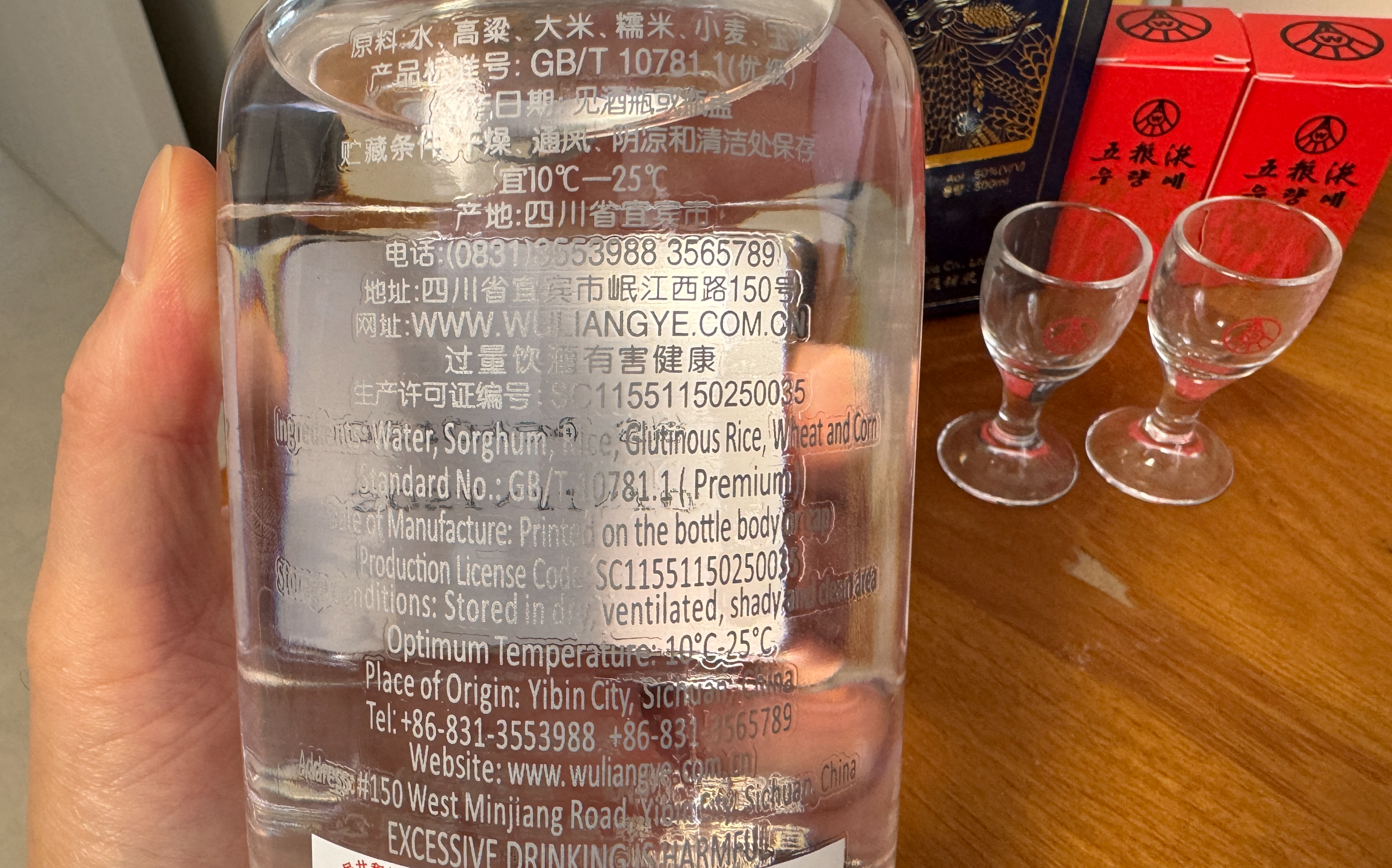 재료는 물, 고량(수수), 쌀, 찹쌀, 밀, 옥수수. 적정 음용 온도는 10-25°C. 상온에서 마시면 된다는 얘기다.