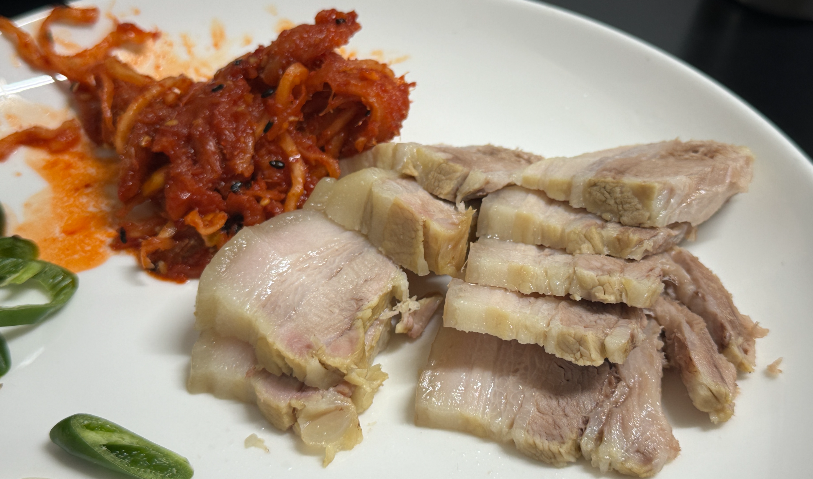 이번에도 마음에 들었던 돼지 삼겹살 수육. 개인적으로 인원이 많지 않으면 '어복쟁반 + 돼지수육 + 전' 조합이 가장 좋은 것 같다.