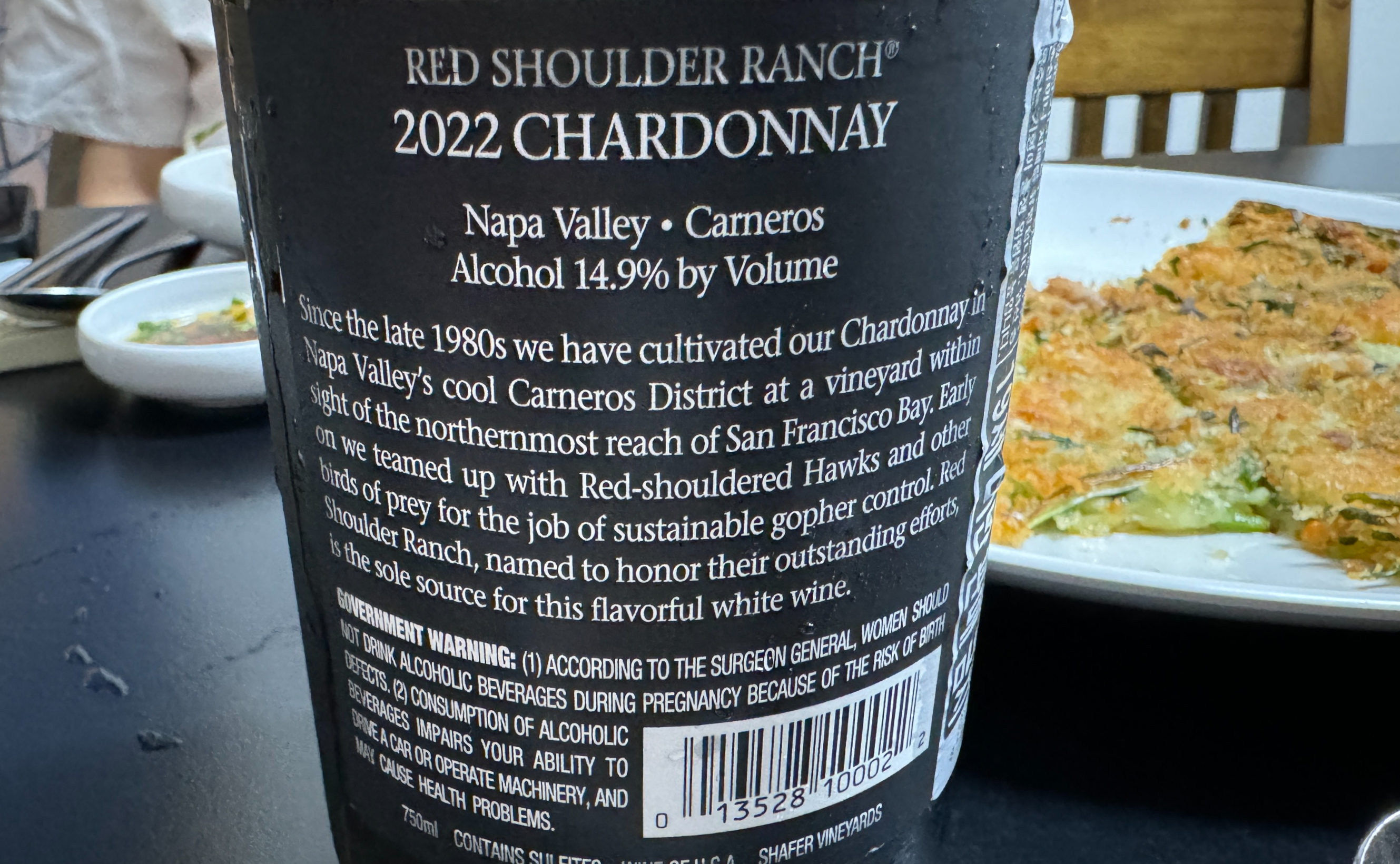 Shafer Red Shoulder Ranch Napa Valley Carneros Chardonnay 2022. 아직 많이 어리지만, 그래서인지 은은한 바닐라 오크와 향긋한 꽃 향기, 신선한 과일 풍미가 더욱 선명하게 드러나는 듯했다. 젖산발효를 하지 않아 상큼한 신맛이 인상적으로 드러나며, 탄탄한 구조감과 우아한 미감을 겸비했다. 정말 마음에 드는 나파 샤르도네. 다음에도 적당한 가격에 보인다며 또 구매할 것 같다.