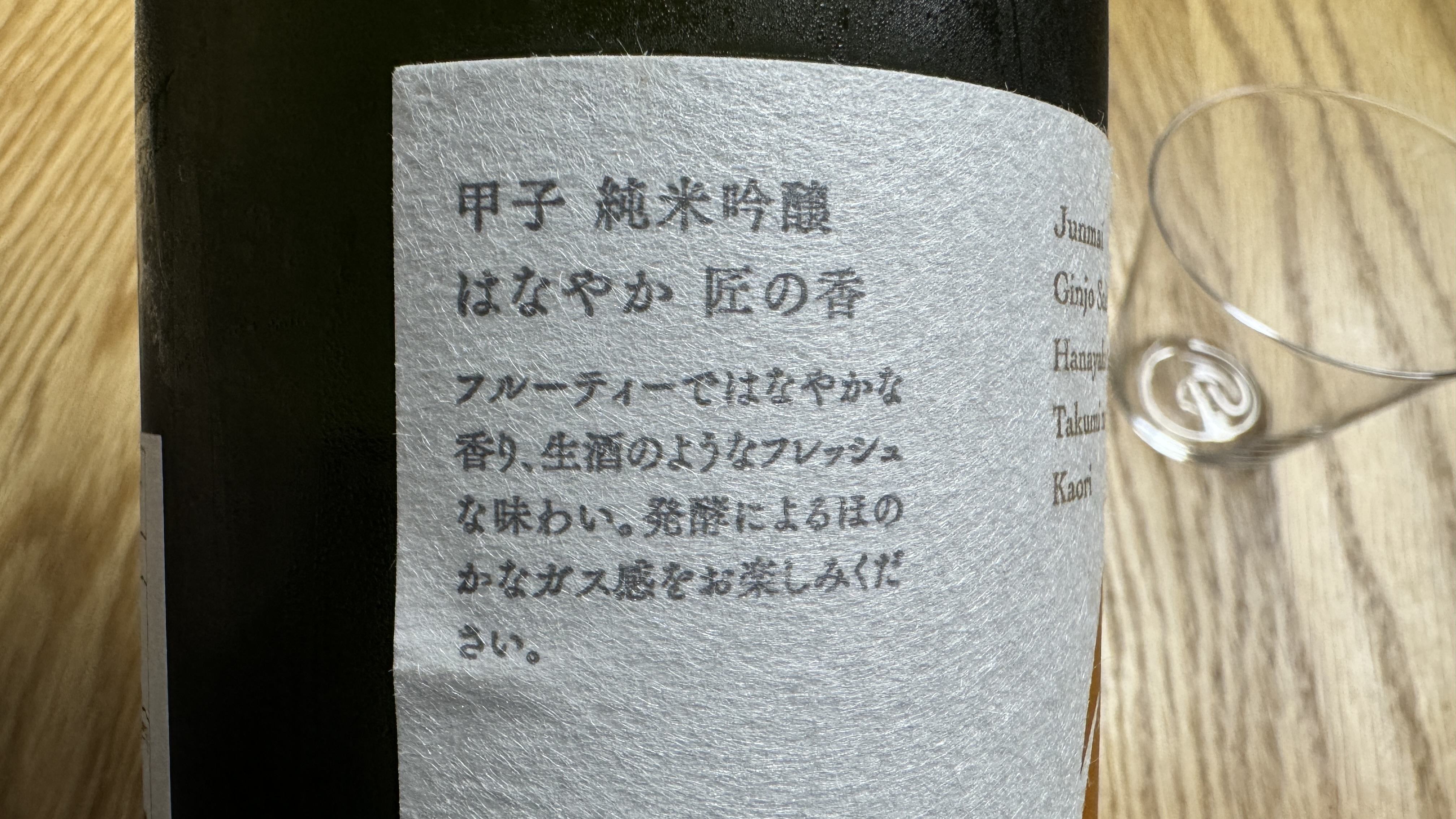 와인을 곁들이려다가 급선회해서 선택한 사케, 키노에네 준마이긴조 하나야카 타쿠미노카오리(甲子 純米吟釀 はなやか 匠の香). 이름 참 길다..헥헥헥;;;