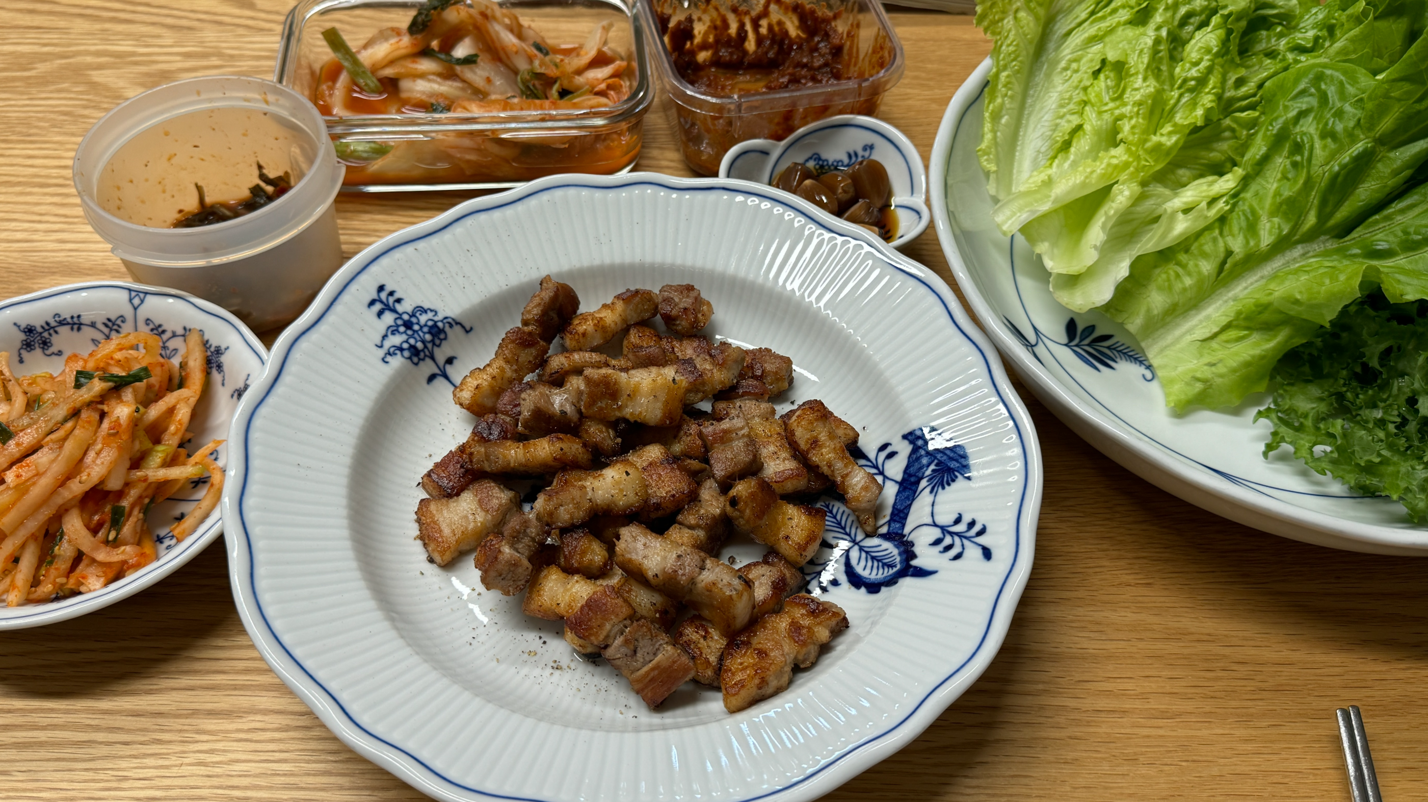 거기에 싱싱한 쌈채소와 김장 김치, 채김치와 각종 짠지를 곁들였다.