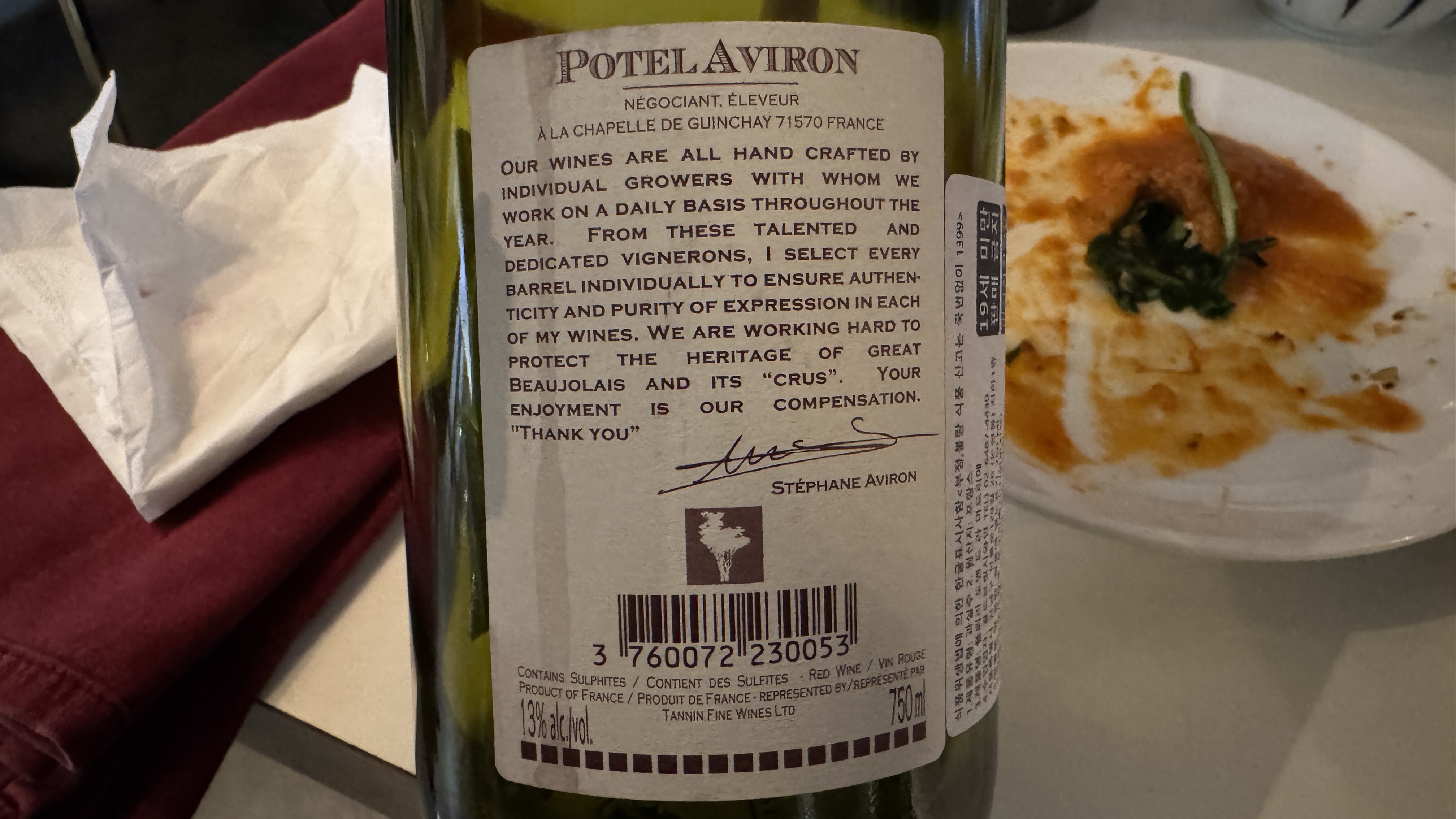 지참한 와인 중 첫 번째, Stephane Aviron, Fleurie Domaine de la Madriere Vieilles Vignes 2016. 3년 전에 구매한 녀석인데 이제야 오픈했다. 코를 대는 순간 플레리 답게 향긋한 붉은 꽃향기가 화사하게 드러난다. 거기에 붉은 자두, (검)붉은 베리, 붉은 체리 풍미가 영롱하게 드러난다. 깔끔한 산미는 과하지 않게 드러나며, 영롱한 미네랄과 함께 잡미 없이 깨끗한 여운을 선사한다. 복합적인 뉘앙스보다는 클린한 스타일이 섹시한 플레리.