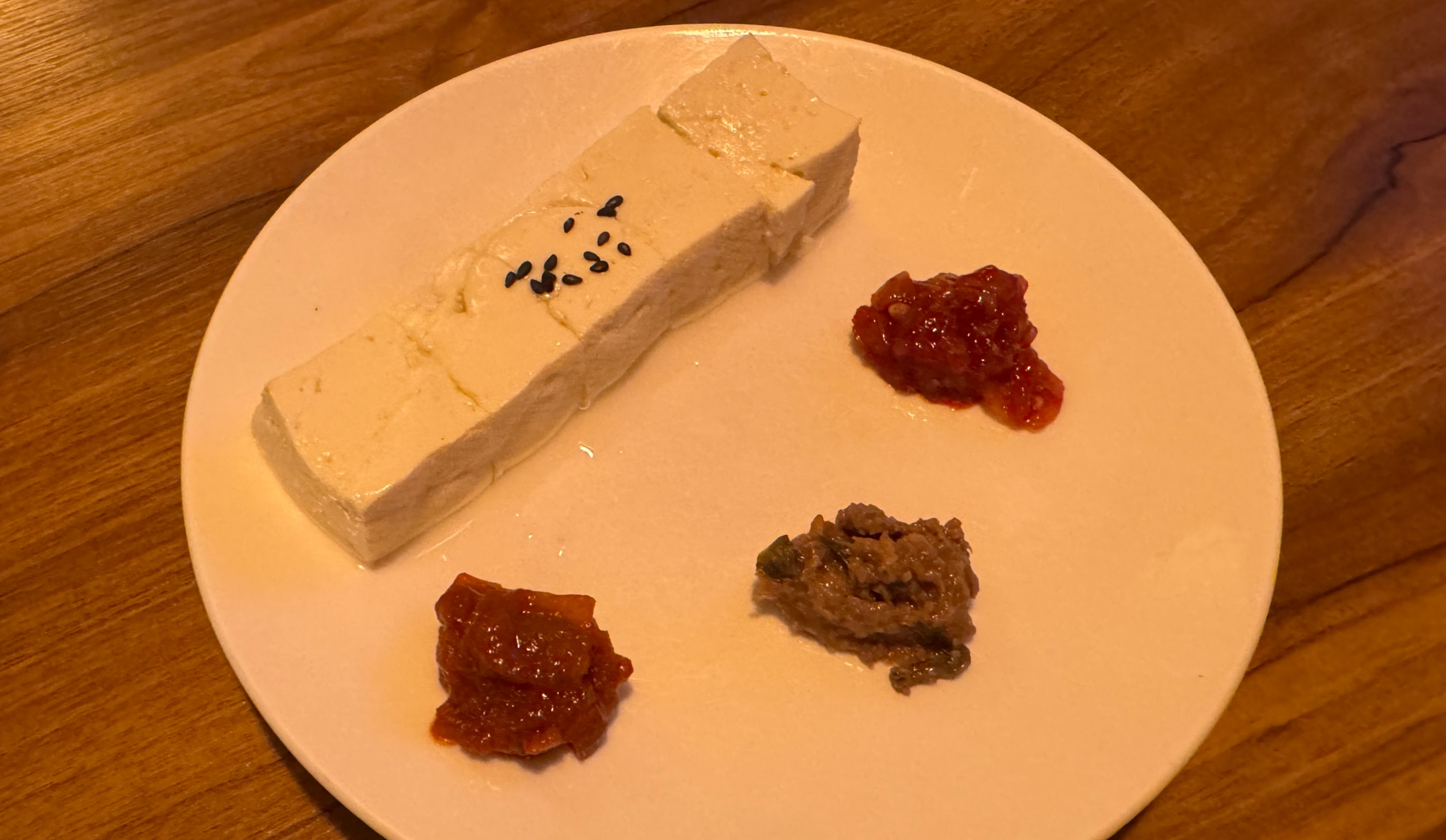 아주 마음에 드는 기본안주. 따뜻하게 데운 두부에 젓갈, 된장소스, 볶은 김치를 곁들여 먹으면 된다.