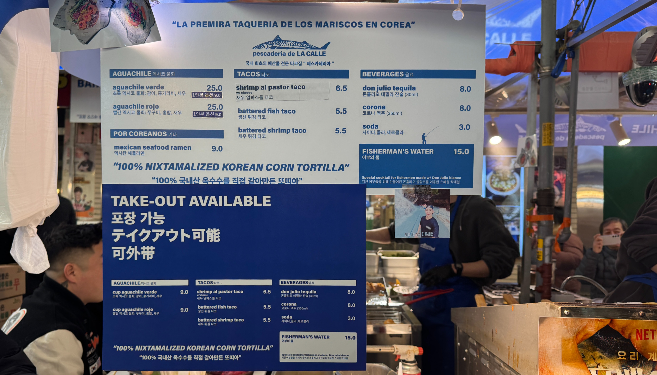 메뉴판 해산물을 이용한 타코 외에 멕시코 스타일 물회(?)가 준비돼 있다. 돈 훌리오와의 콜라보인 만큼 돈 훌리오 테킬라와 돈 훌리오를 이용한 칵테일 Fishman's Water 또한 함께 즐길 수 있다. 1인용 메뉴도 있으니 혼술 또한 오케이.