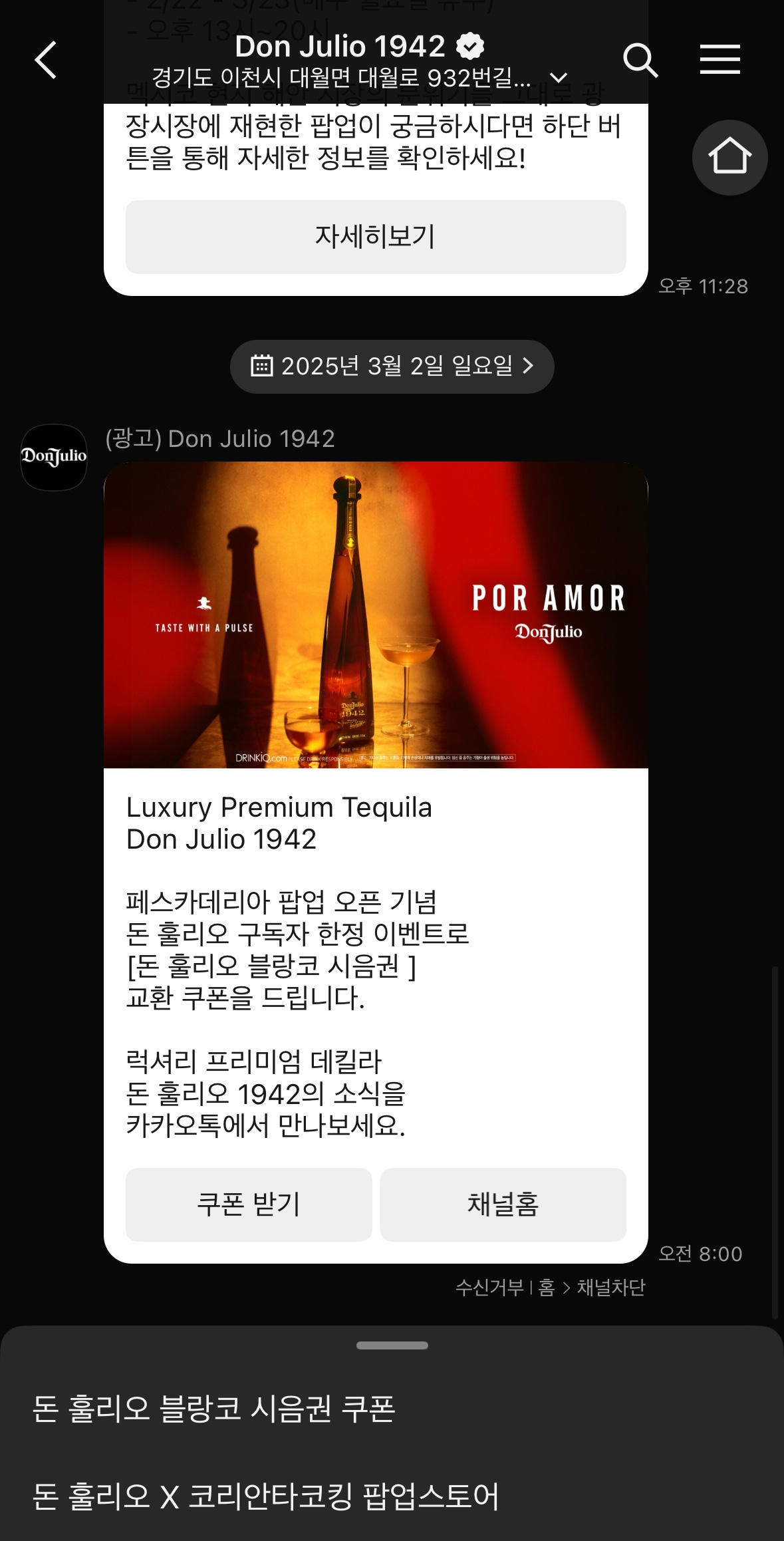 일단 돈 훌리오 카카오톡 채널을 구독하면 받을 수 있는 100% 증정 쿠폰. 팝업에서 음식을 결제하며 쿠폰을 보여 주면 돈 훌리오 블랑코 미니 보틀을 바로 준다.