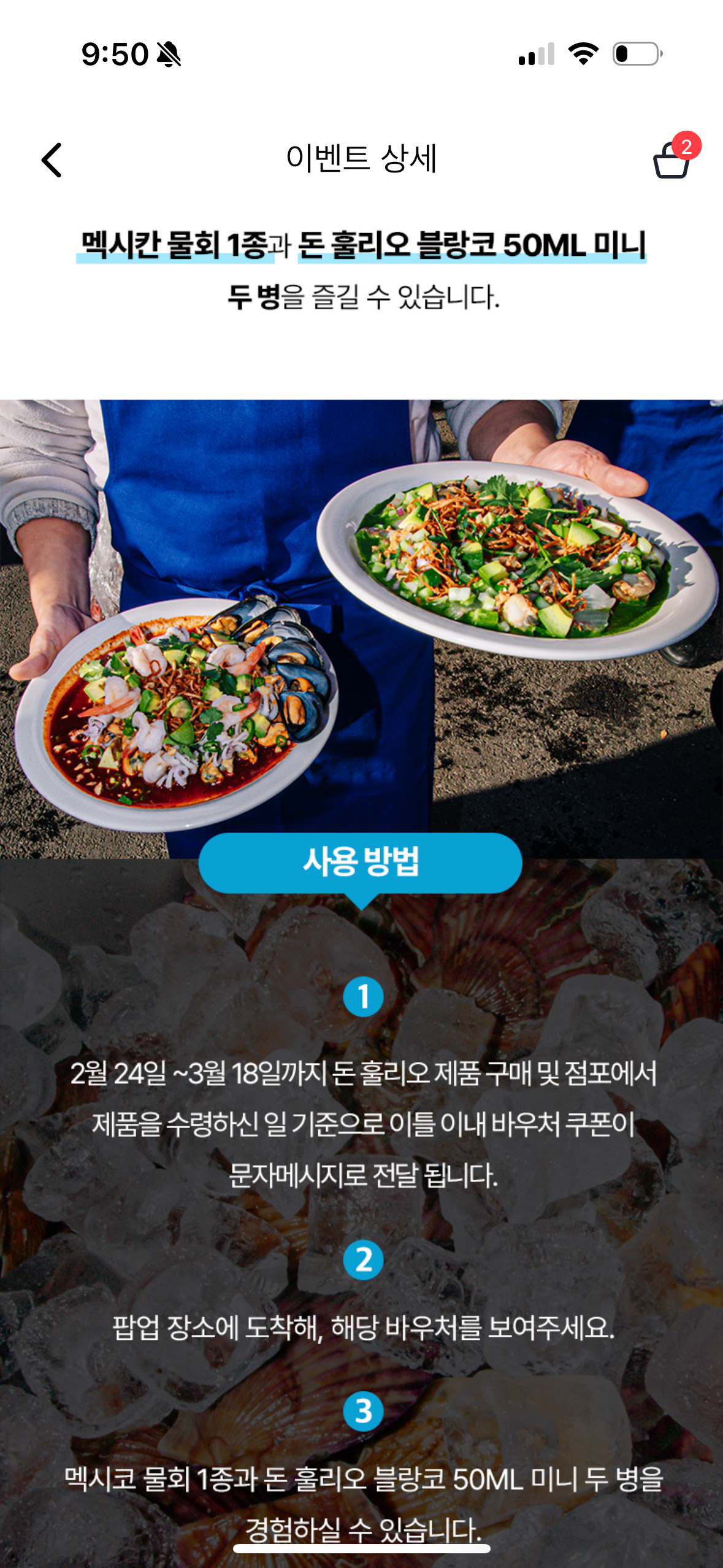 바우처로는 돈 훌리오 블랑코 미니 보틀 2개와 물회 1종을 즐길 수 있다. 물회는 1인분을 주는지, 2.5만 원 상당의 정량을 주는지 확실치 않은데 뭘 받든 나쁘진 않은 것 같다. 정량을 주는 거라면 진짜 혜자로운 프로모션이라고 할 수 있을 듯.