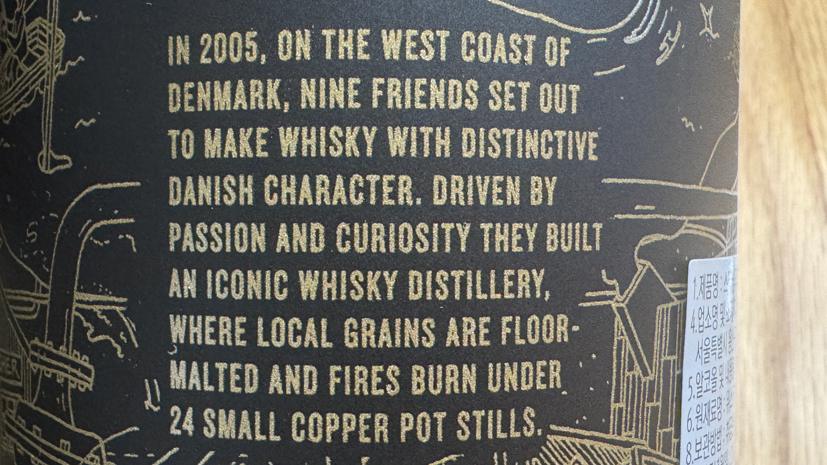 일단 모든 재료가 덴마크 산이다. 덴마크에서 재배한 호밀과 보리를 직접 플로어 몰팅 해서 맥아를 만든다. 증류는 직접 가열하는 작은 팟 스틸(pot still)에서 진행한다. 각 공정마다 비용이 많이 드는 방법을 채택한 것이다.
