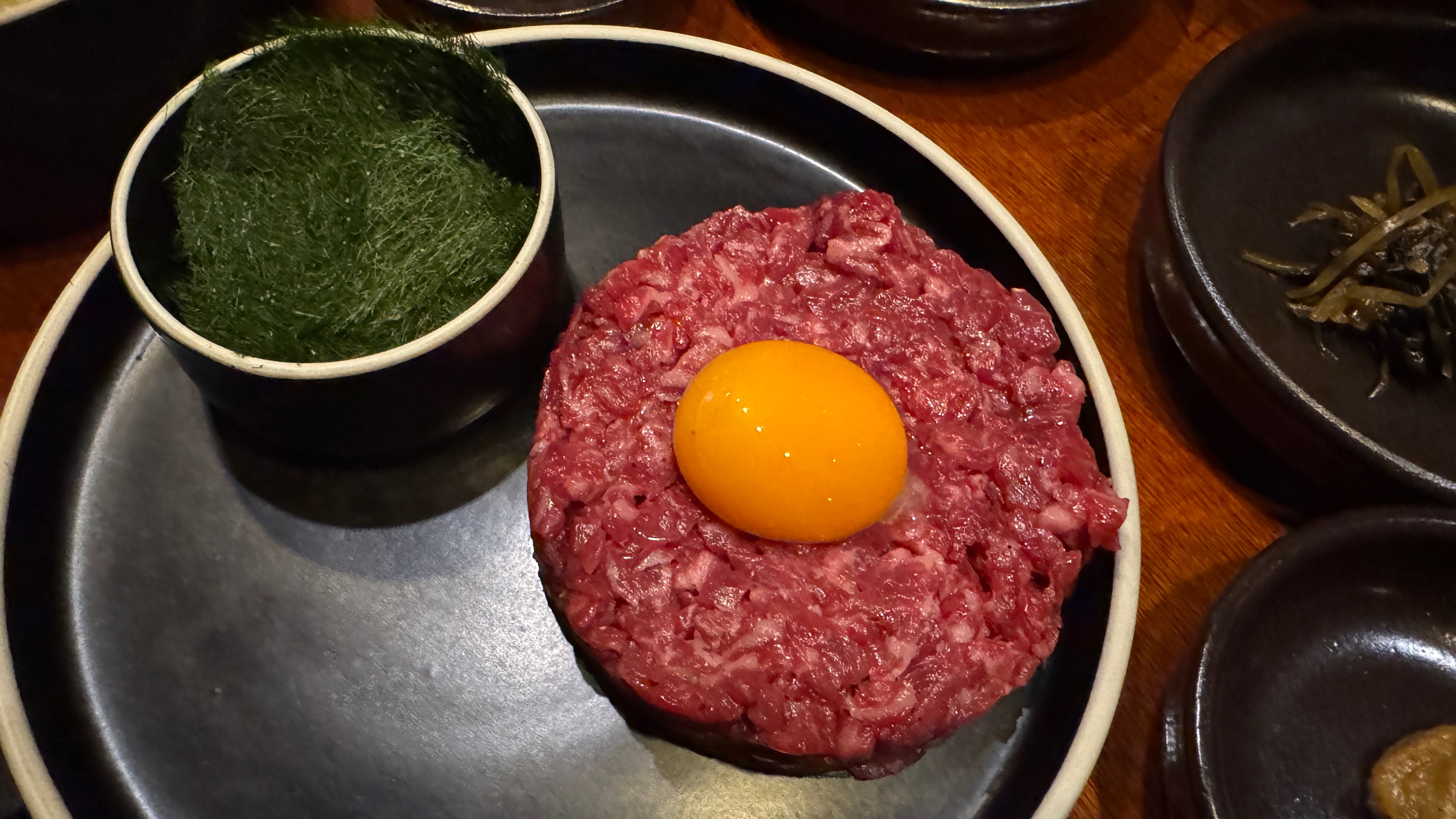 시작은 한우 육회로. 절반은 고기만, 절반은 계란 노른자와 섞어 감태에 싸서 먹었다. 둘 다 샴페인 안주로 아주 좋았다는.