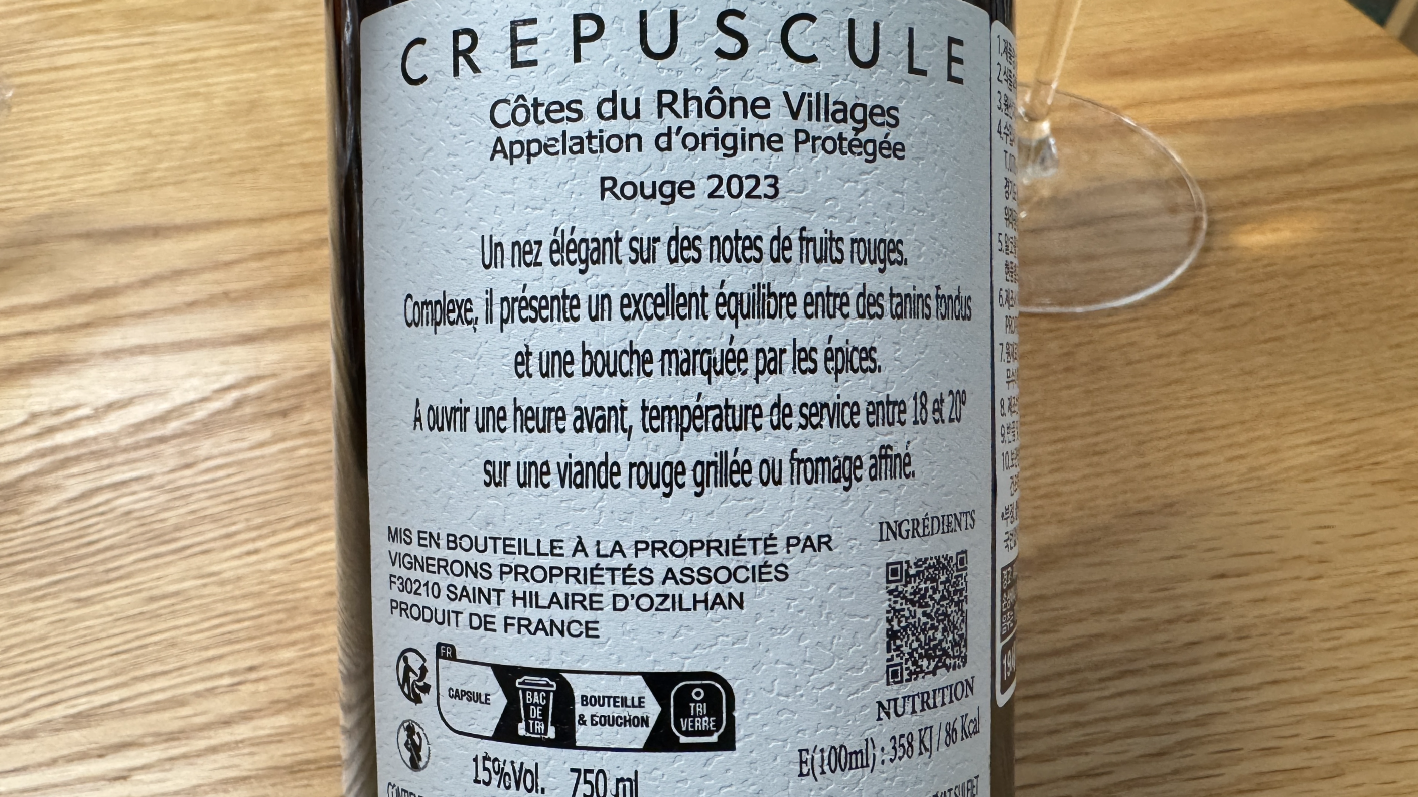 Vignerons Proprietes Associes, Crepuscule Cotes du Rhone Villages 2023. 지난달에 서초동 와인샵 와인스코프에서 구매한 와인이다.