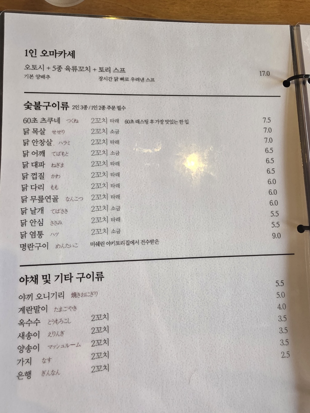 꼬치 5개 오마카세가 1.7만 원이다. 길거리 닭꼬치 가격보다 저렴한 수준. 완전 혜자인데??