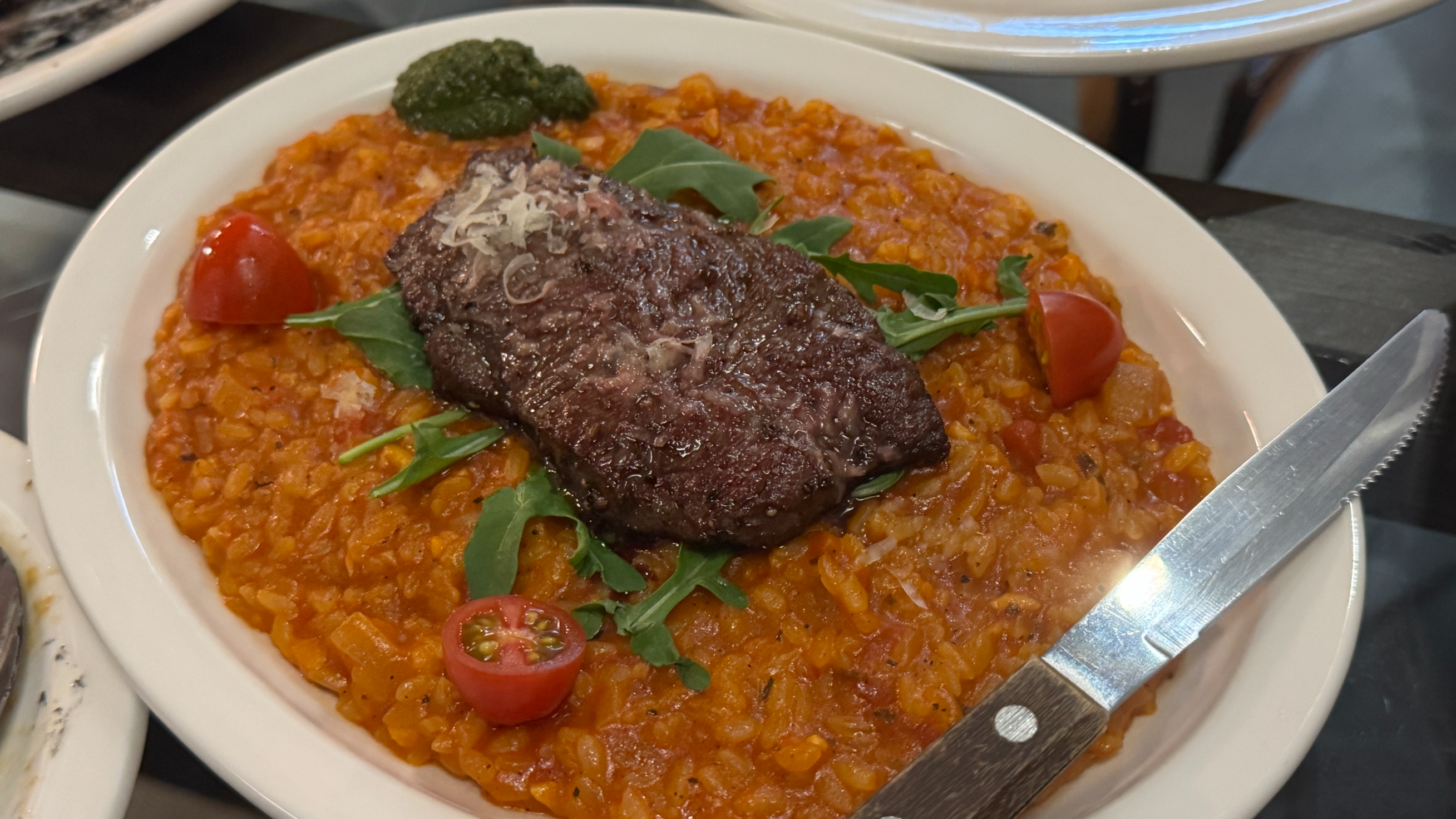 부채살 스테이크가 올라간 토마토 리소토. 요것도 맛있긴 하지만 고기가 올라간 디시를 선택한다면 고르곤졸라 리소토와 풍기트러플 치킨 리소토가 좋은 것 같다.