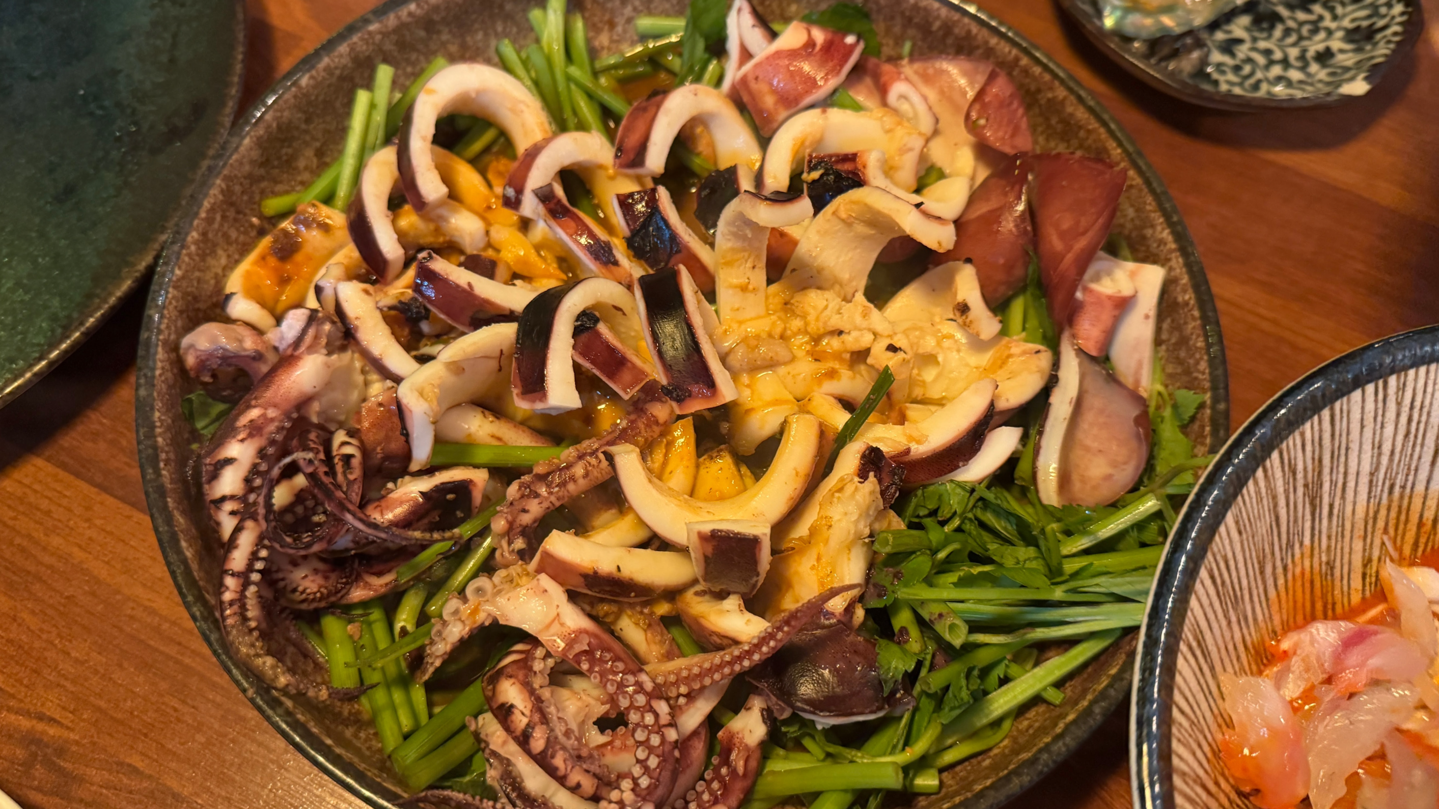 한치 한 상. 한치회에 물회, 다리 튀김을 모두 즐길 수 있다. 그런데... 하필 한치가 물이 안 좋아 구입을 안 하셨다고ㅠㅠ 어쩔 수 없이 언제나처럼 해산물 모둠으로 시작.