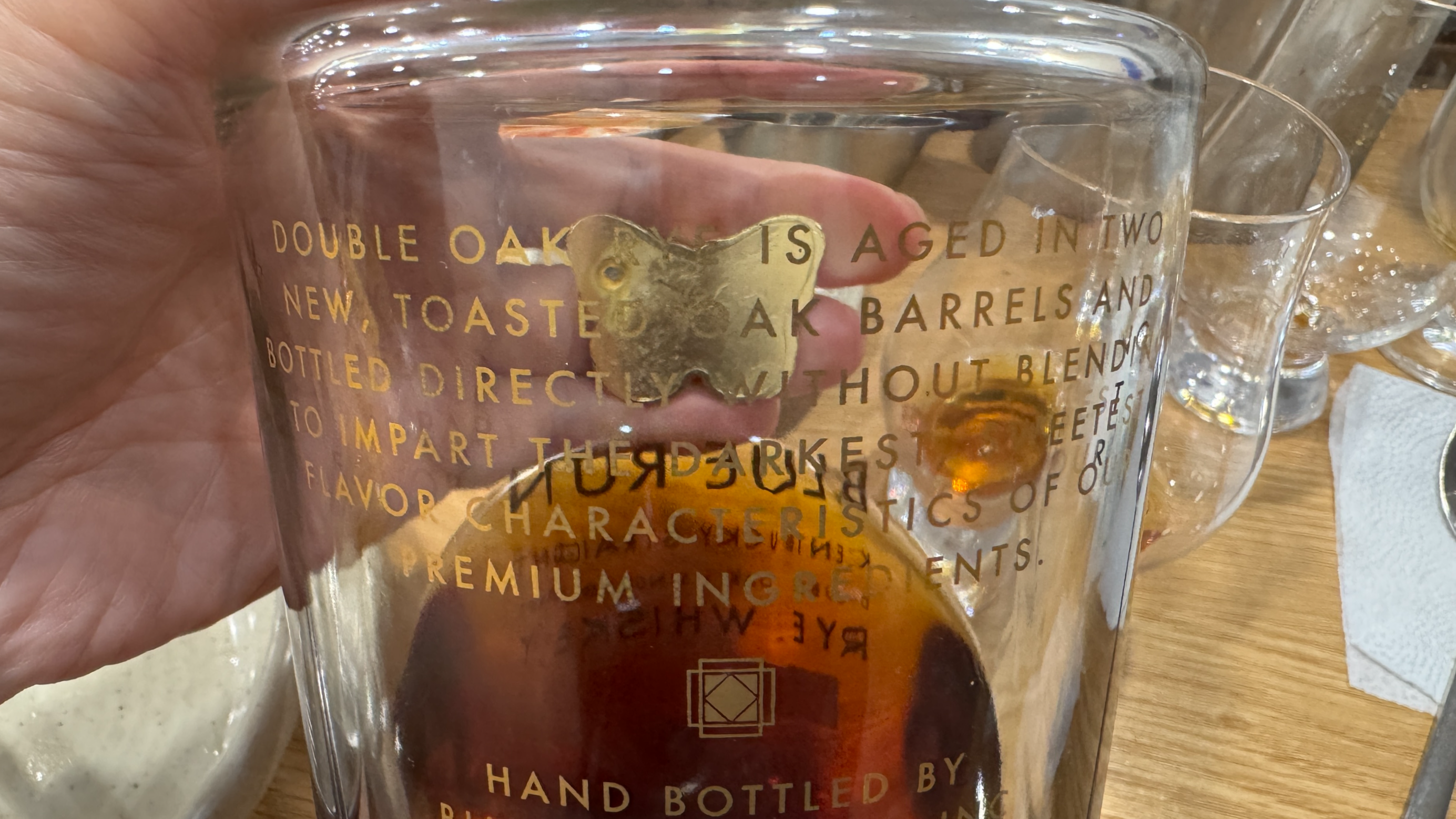 투명한 병 뒷면의 텍스트는 읽기가 어렵다. 대략 새 토스티드 오크 배럴 두 개에서 (차례로) 숙성한 후 블렌딩 없이 그대로 병입한다는 이야기인 듯.