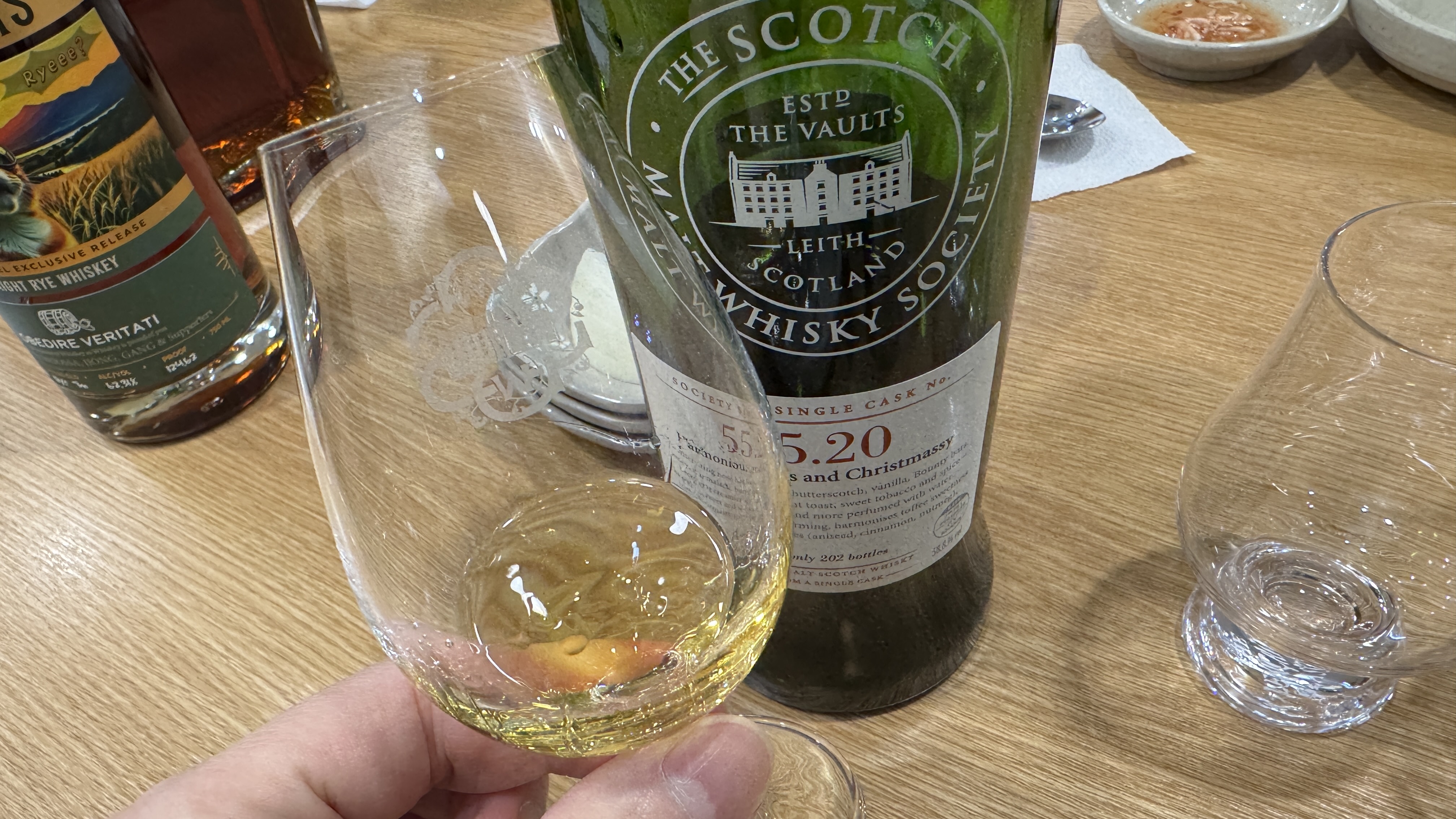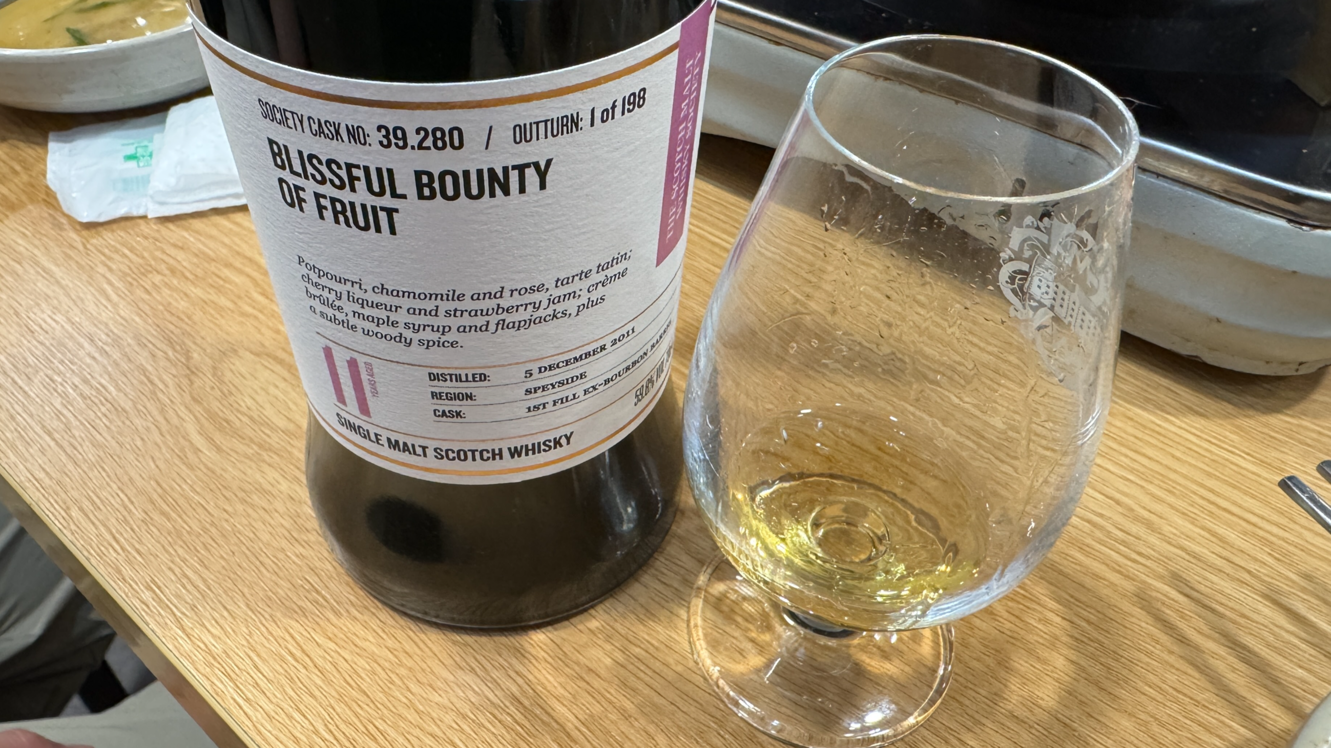 내가 가져간 SMWS 39.280(Linkwood) 11yo. 내가 가져간 거라 마시지 않으려 했는데, 다들 호평을 하시는 걸 듣고 한 모금 맛을 봤다. 달달한 과일 사탕, 피니시에 후추 스파이스. 둥근 질감과 준수한 밸런스, 가볍고 섬세한 풍미와 깔끔한 피니시. 전반적으로 편안하고 무난한 버번캐다. 나중에 제대로 다시 맛을 봐야지.