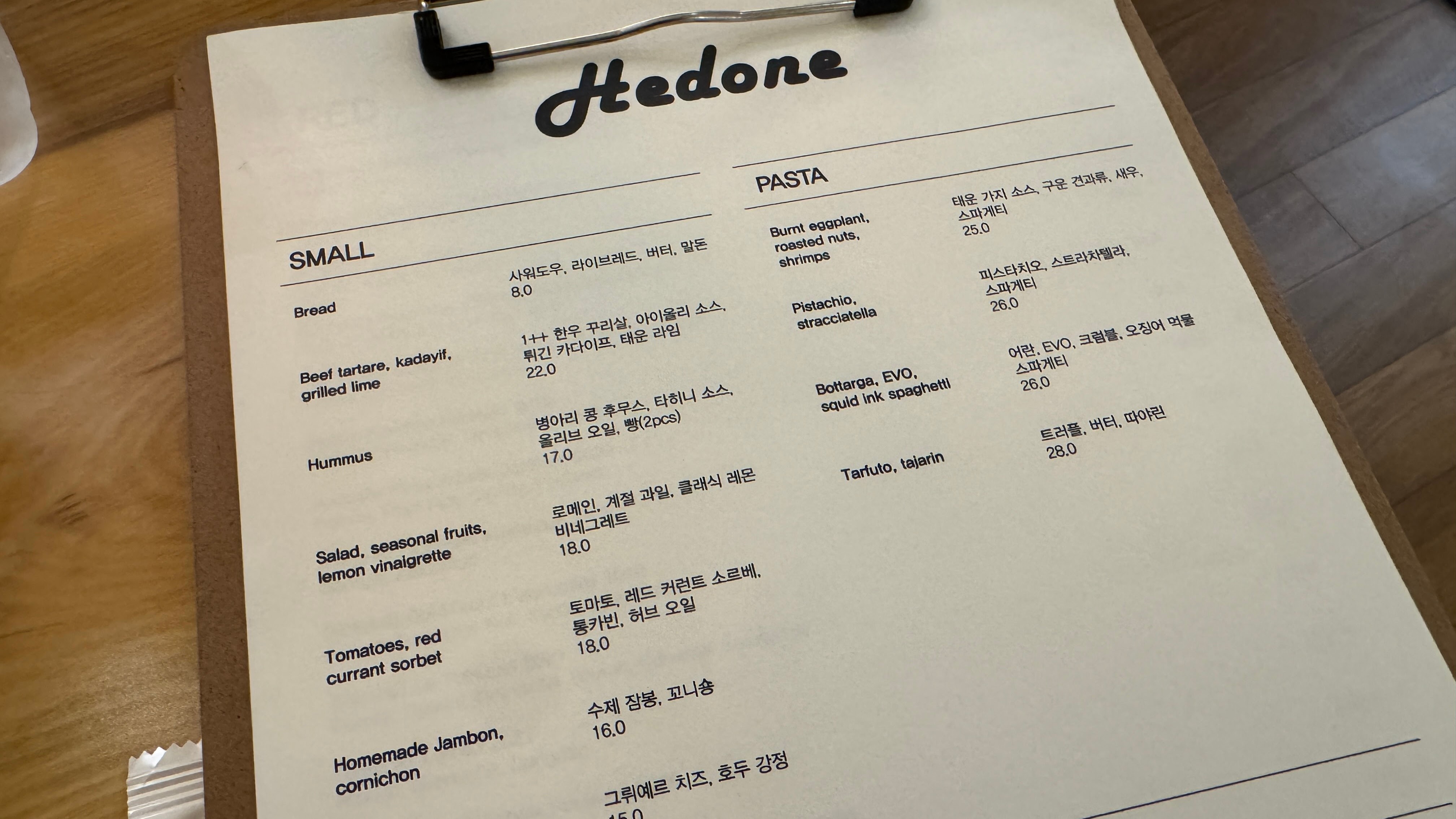 어디에서 하는 게 좋을까 하다가 와인 모임에서 방문했던 헤도네가 떠올랐다. 메뉴 하나하나가 개성적인 레스토랑이다. 예전에 와인 모임에서 방문했는데, 음식도 분위기도 상당히 마음에 들었다.