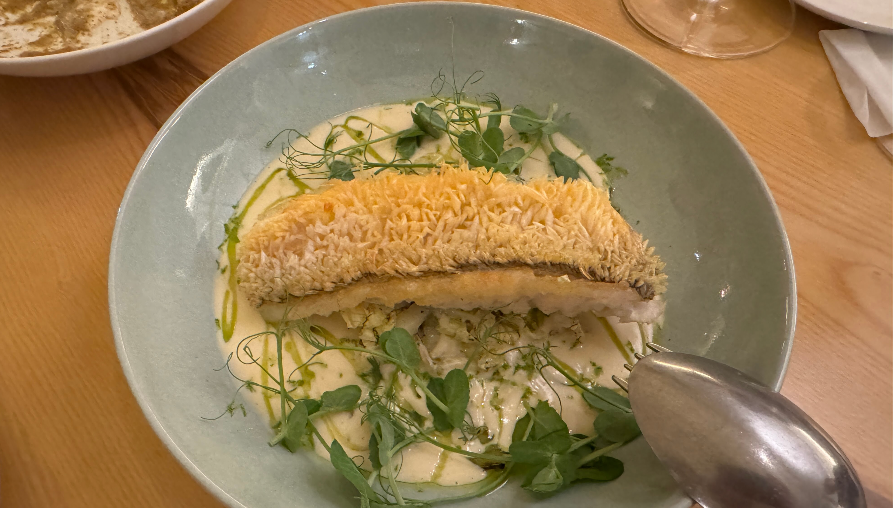 콜리플라워 퓌레, 숯에 구운 알배추, 허브 오일을 곁들인 오늘의 생선. 오늘의 생선은 도미였다. 남아 있던 화이트와 마셨는데, 바삭한 껍질과 새싹, 소스와의 조화가 훌륭했다.