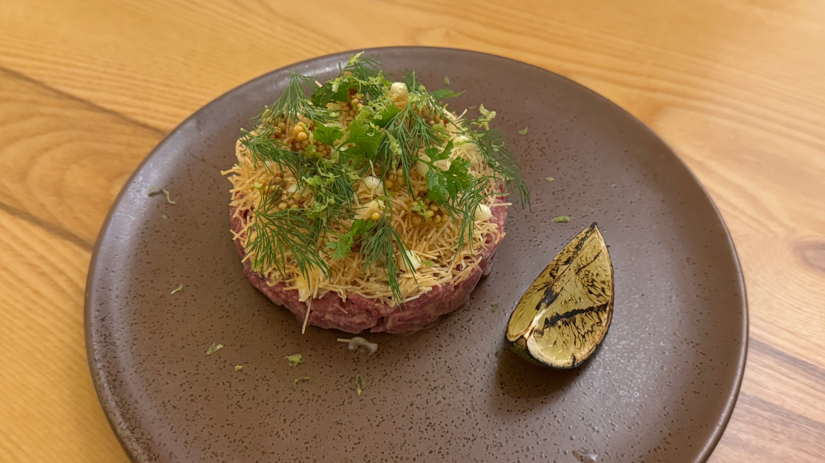 튀긴 카다이프와 라임을 올린 비프 타르타르. 일단 비주얼부터 압도적이다. 풀 바디 화이트, 라이트 한 레드에 모두 어울리는 안주.