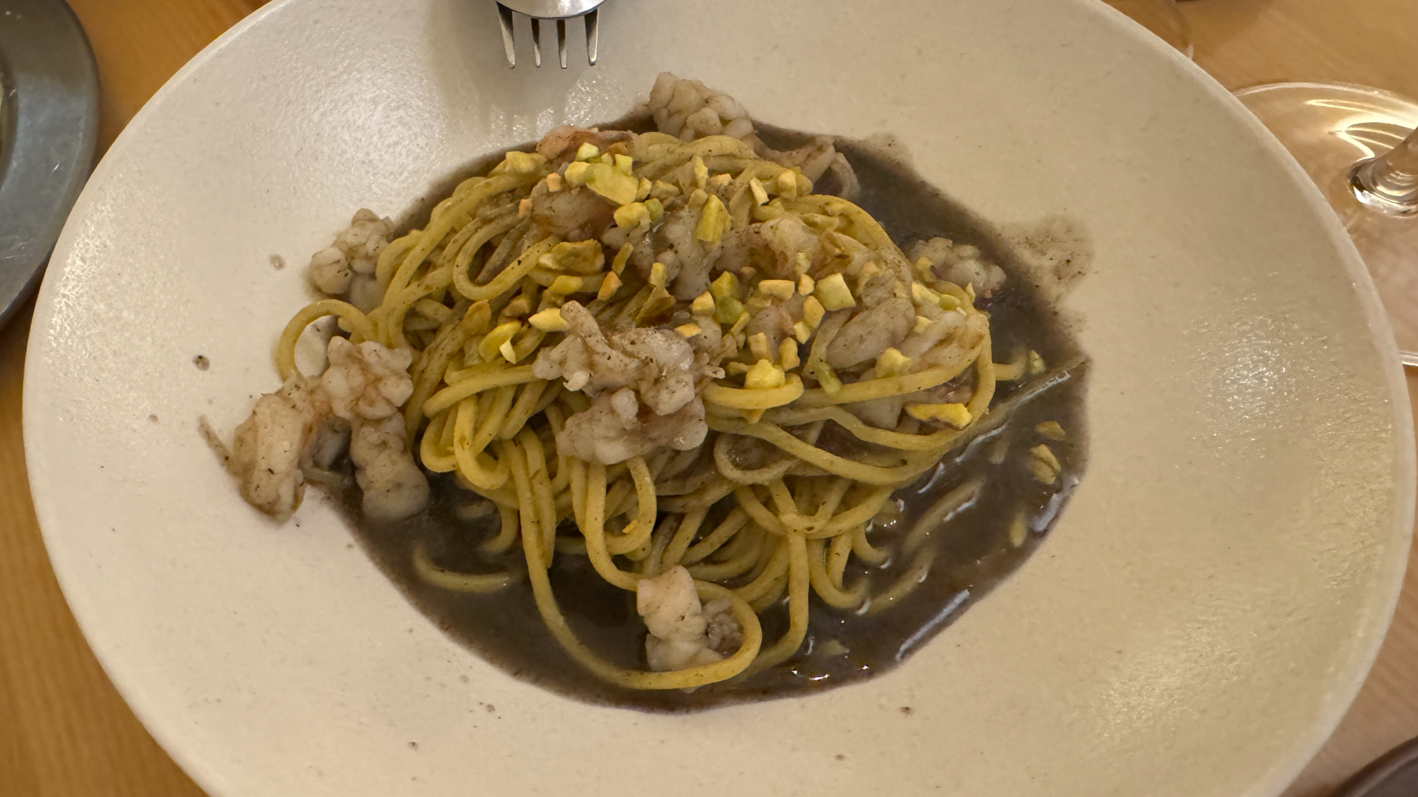 태운 가지, 볶은 견과류, 새우 스파게티. 탱글거리는 새우의 식감이 아주 좋았다.