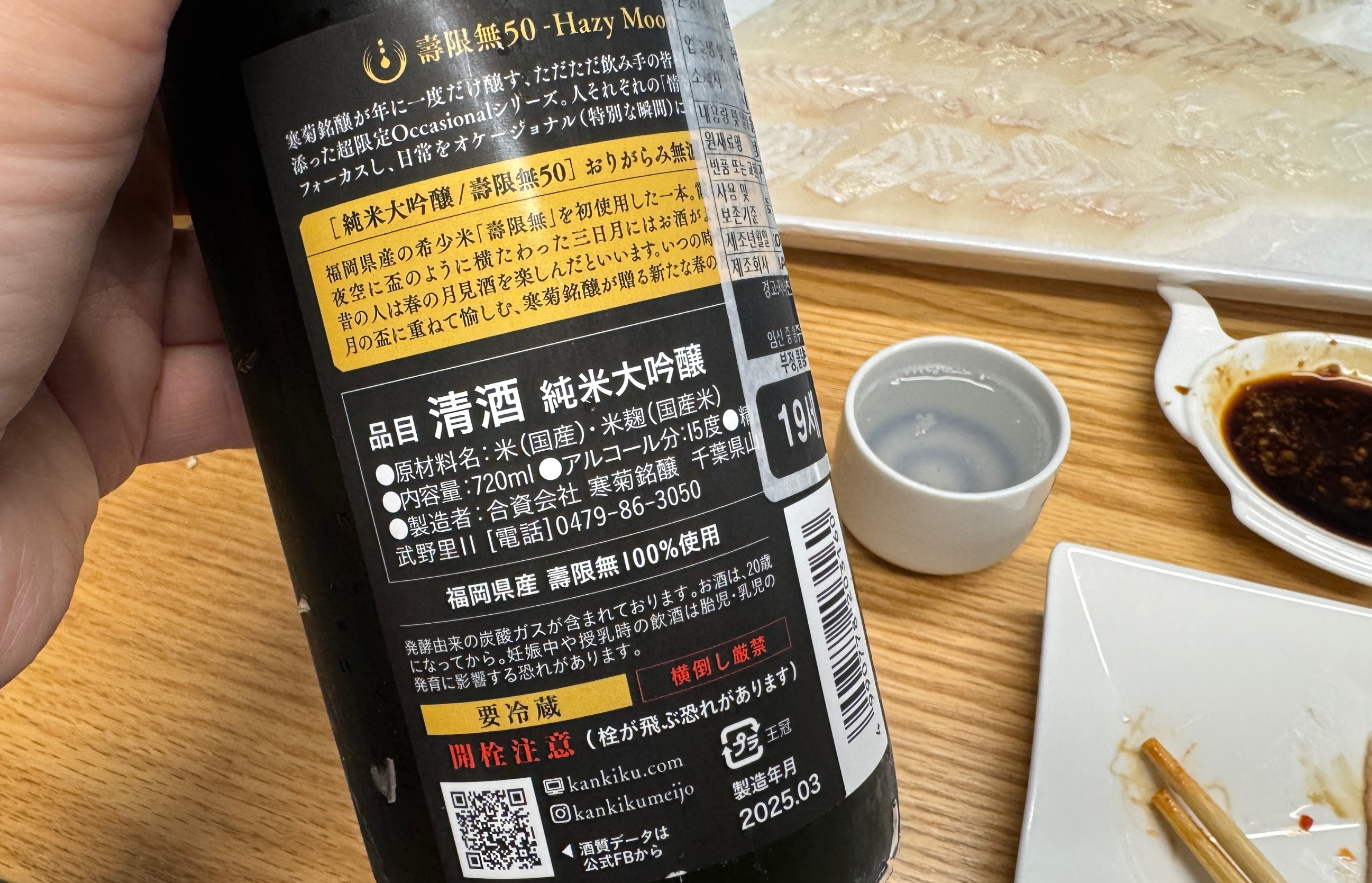두 번째는 사케, 칸키쿠메이조, 주게무 헤이지문(寒菊銘釀, 壽限無 Hazy Moon). 좋아라 하는 칸기쿠의 준마이다이긴조(純米大吟釀) 급 무로카나마겐슈(無濾過生原酒)다.