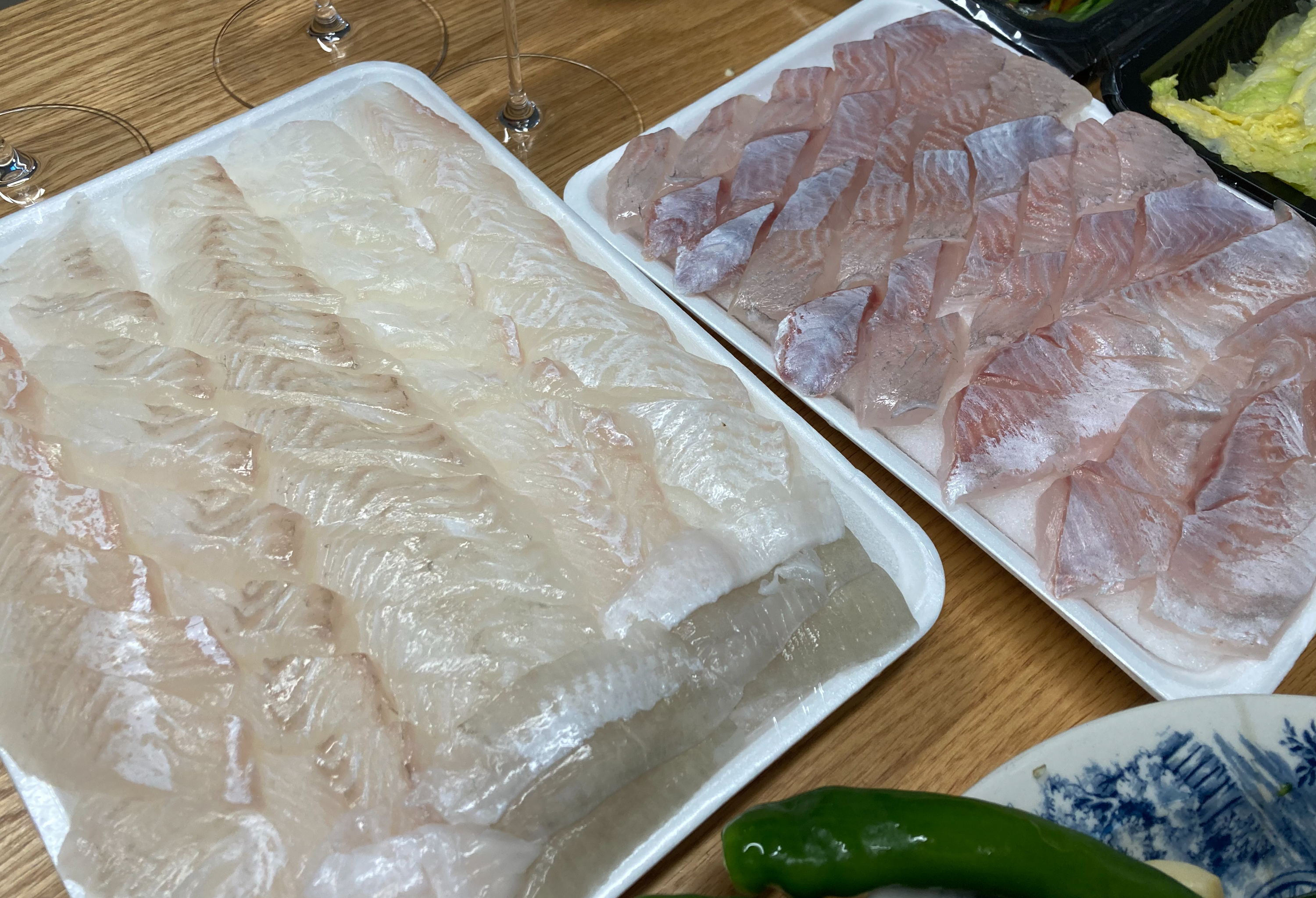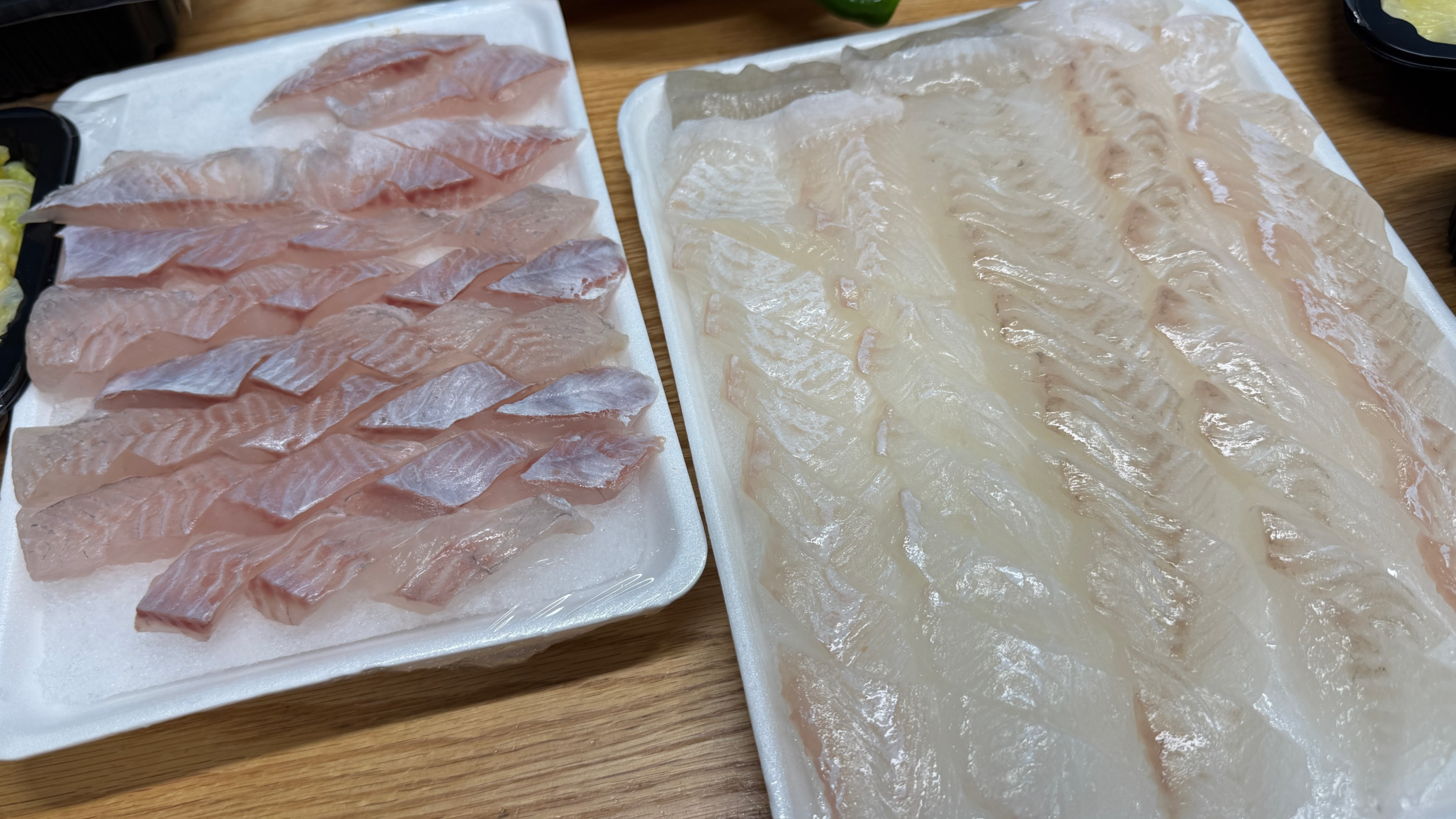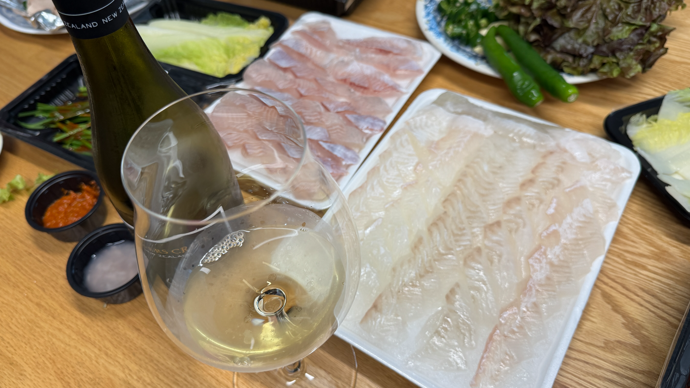 둘 다 도톰하게 썰어서 식감이 좋은데, 돌돔이 더 쫄깃하고 고소한 맛이 있다. 반면 광어는 조금 더 부드럽고 단맛이 느껴진달까.