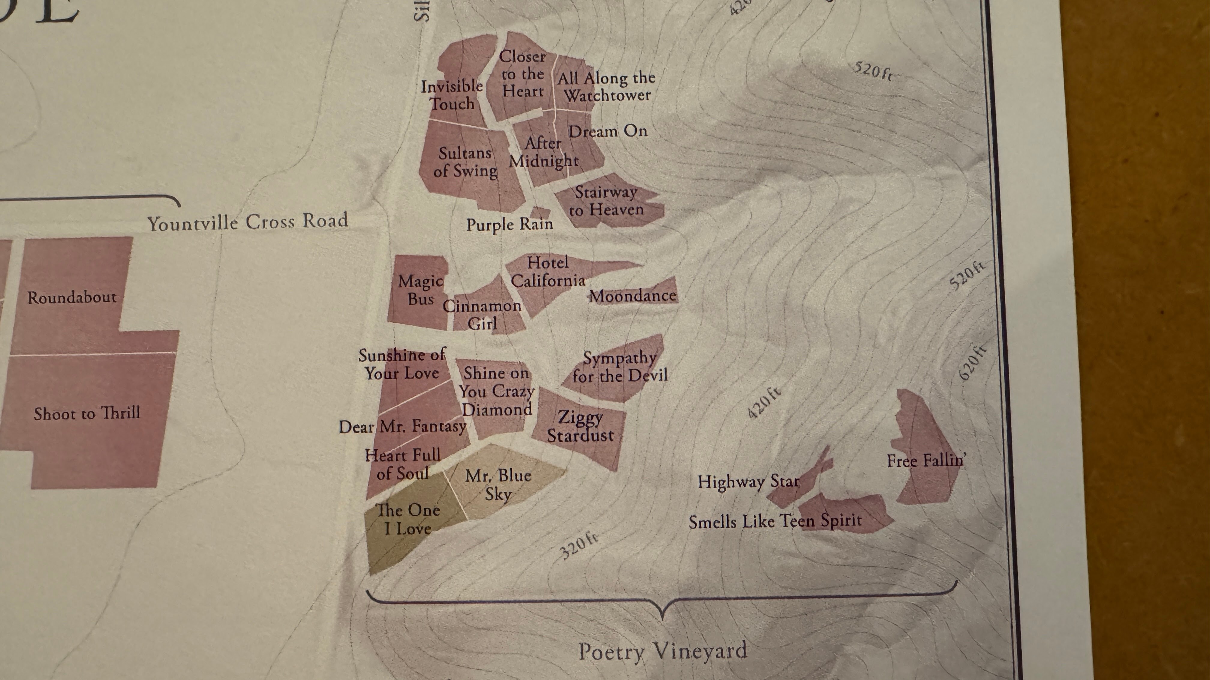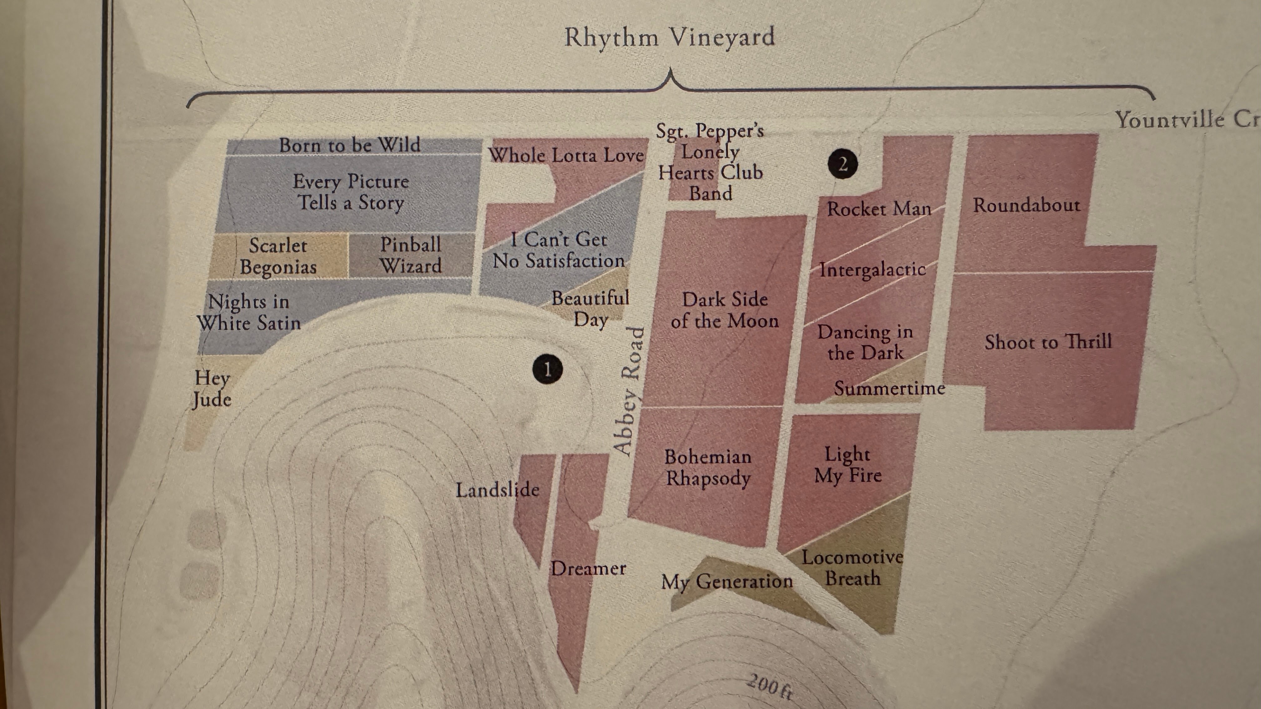 지도를 보니 추가적인 호기심이 생겼다. 포도밭 구획들의 이름이 모두 유명한 노래 제목이다.